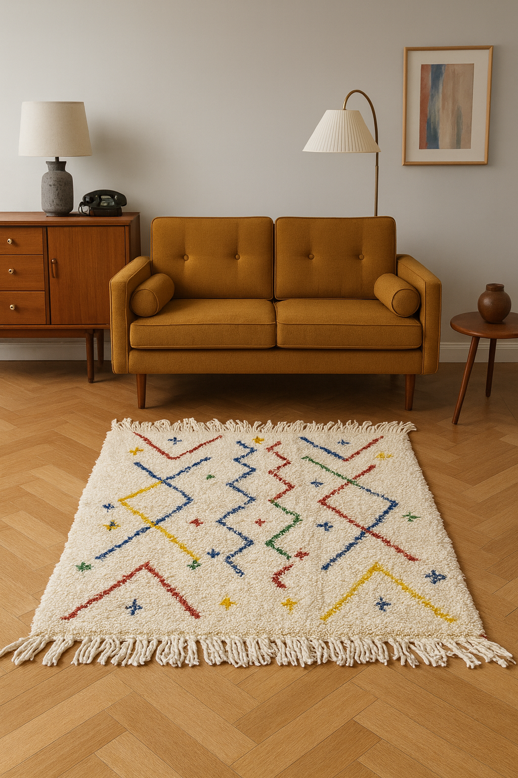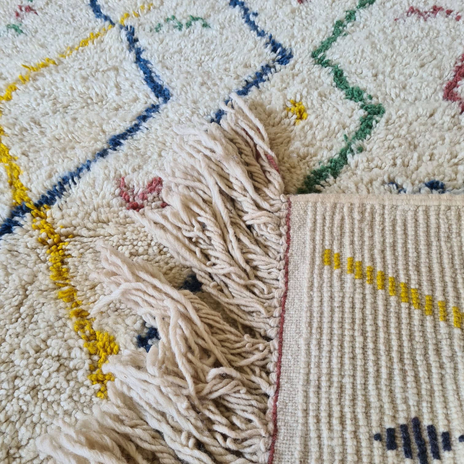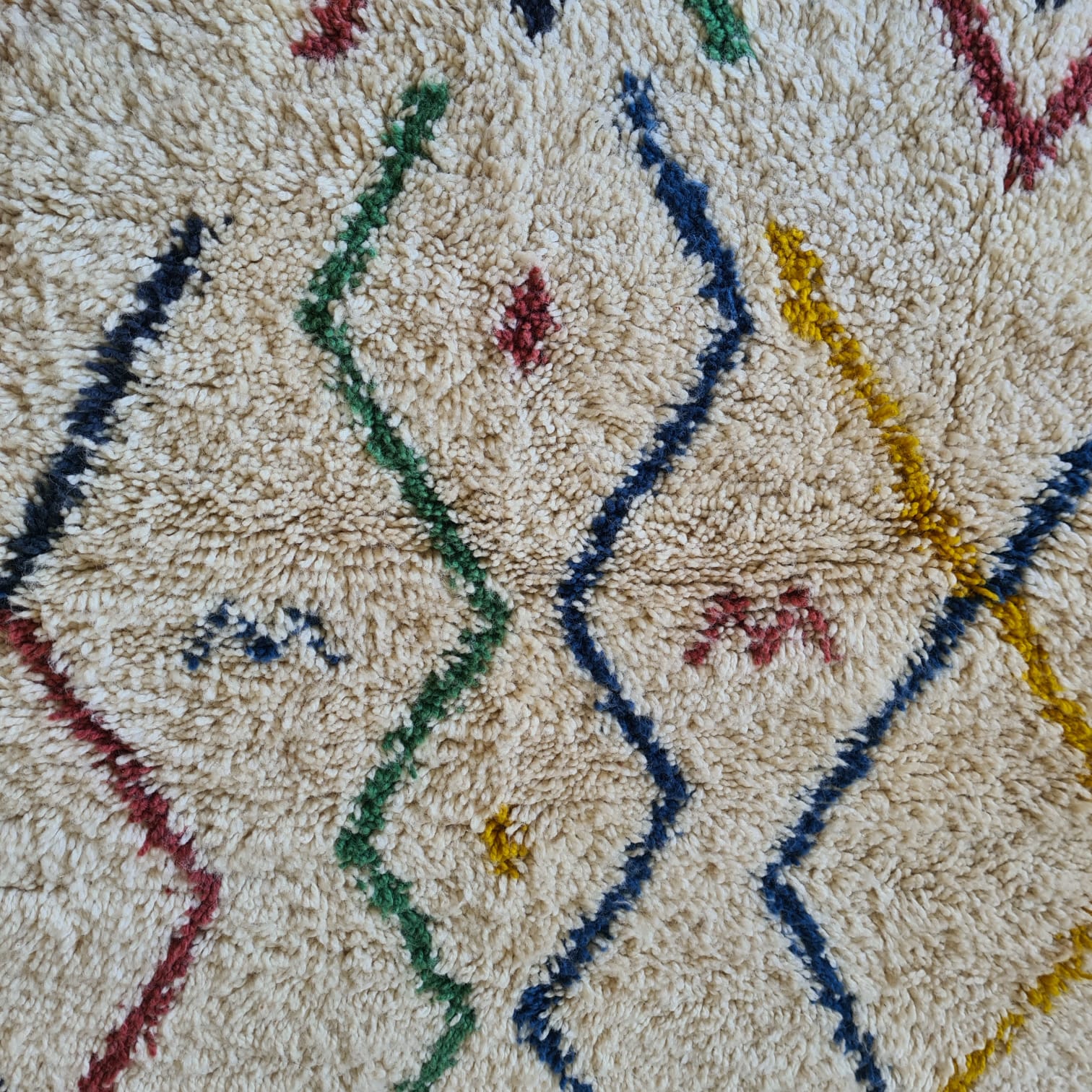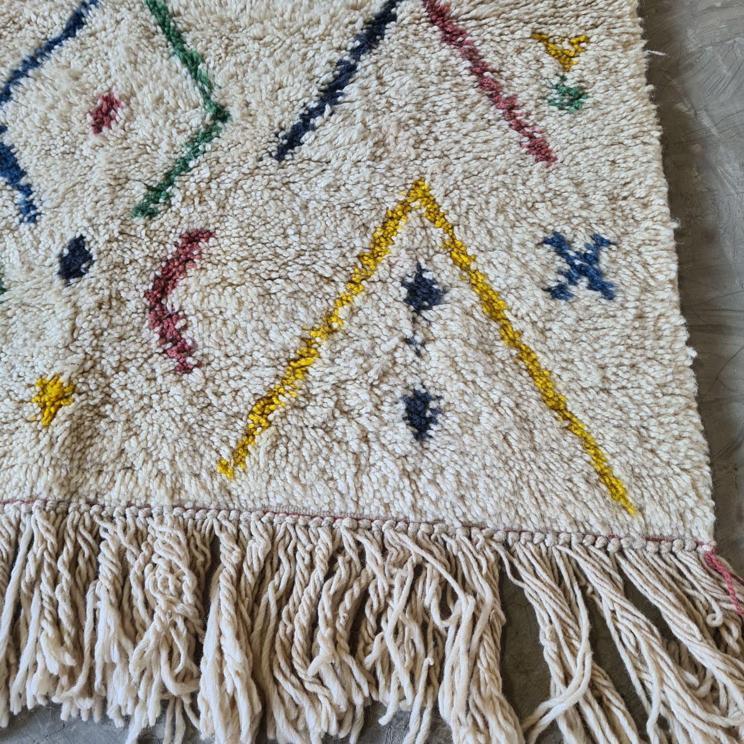 A joyful Azilal woven in undyed ivory wool, animated by hand-drawn zig paths and chevrons in cobalt, saffron, vermilion, and green. The drawing is lively yet balanced, with short flatweave aprons and natural fringe—soft, plush, and easy to place in modern settings.