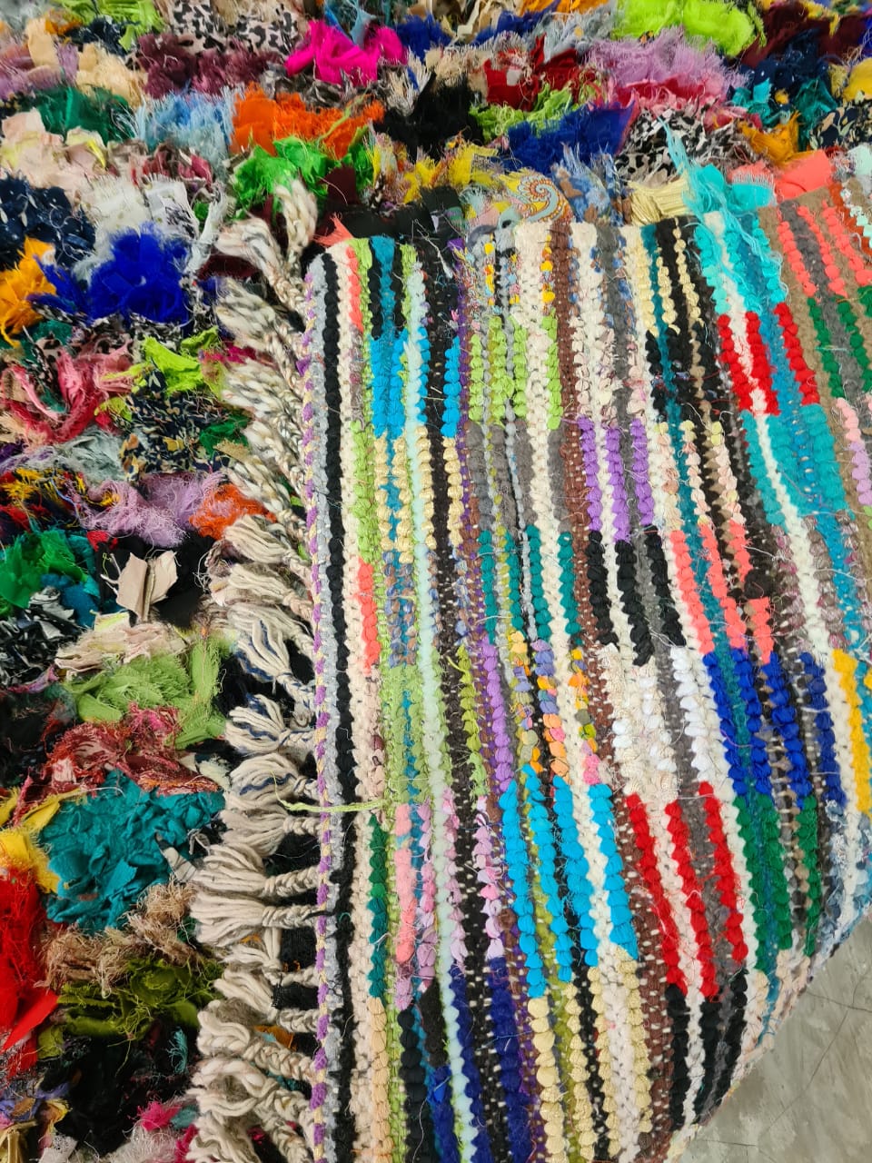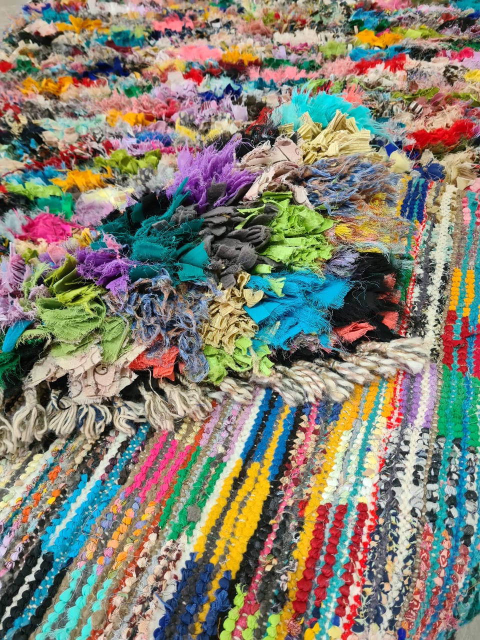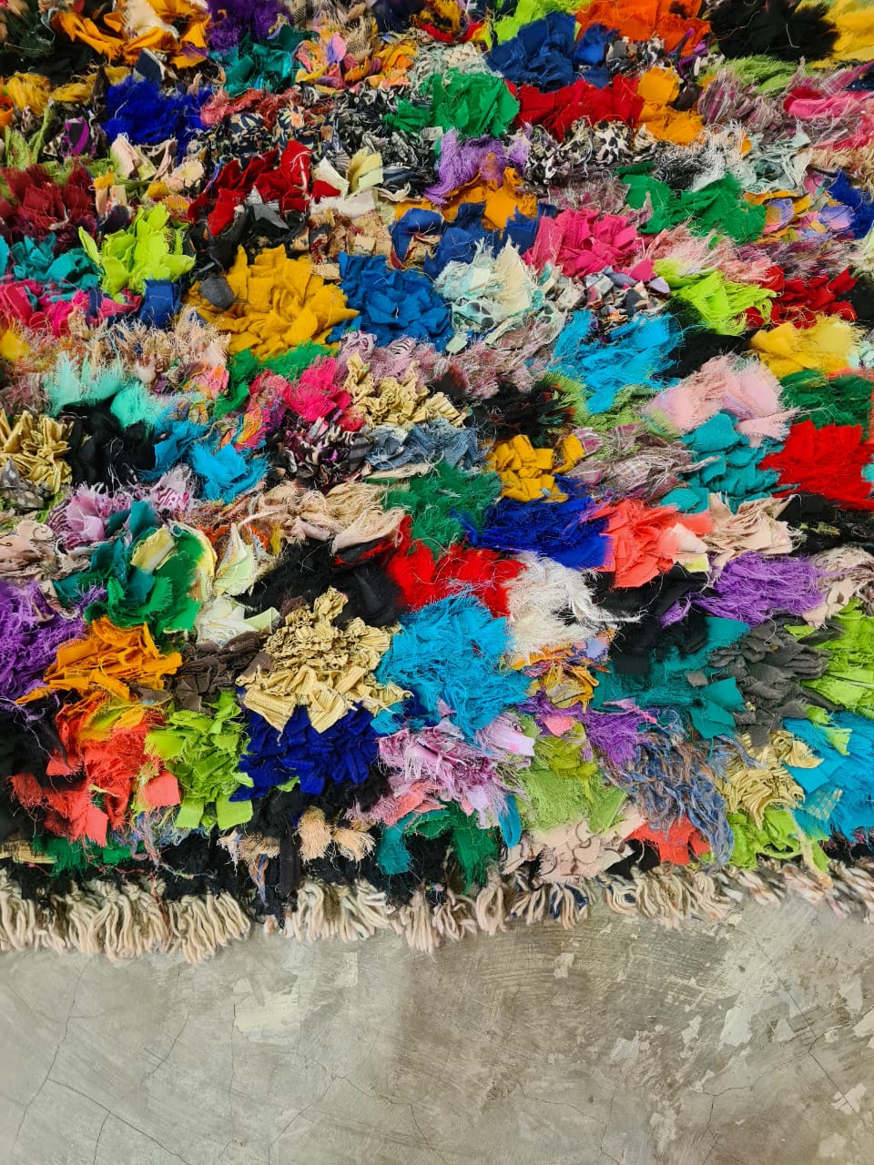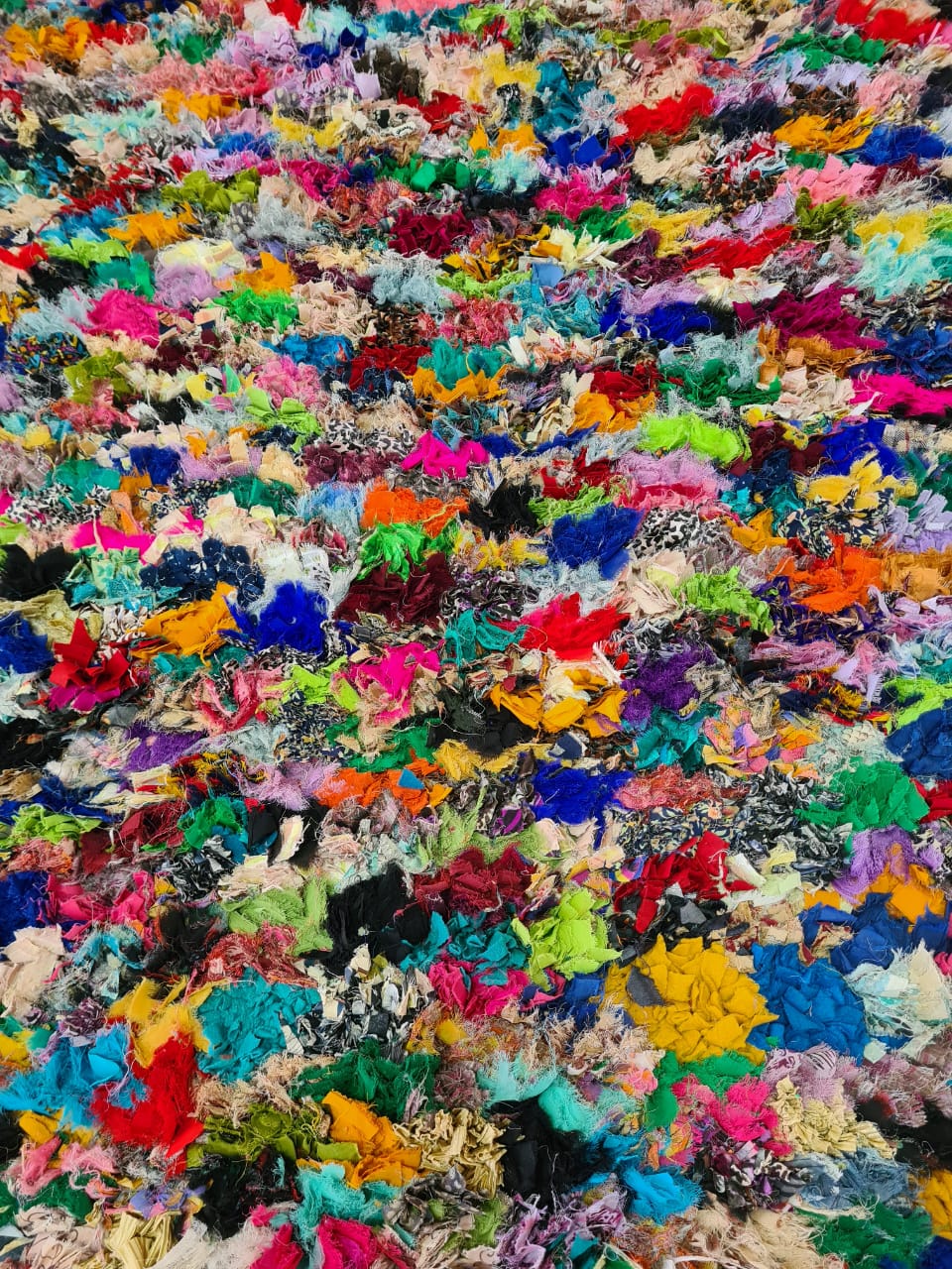 Petals in Rebellion is a kaleidoscopic Boucherouite rug woven from vibrant reclaimed textiles. Here, color runs wild like blooming fields—layered, dense, and utterly liberated from symmetry. It is an aesthetic uprising of fragments made whole again.