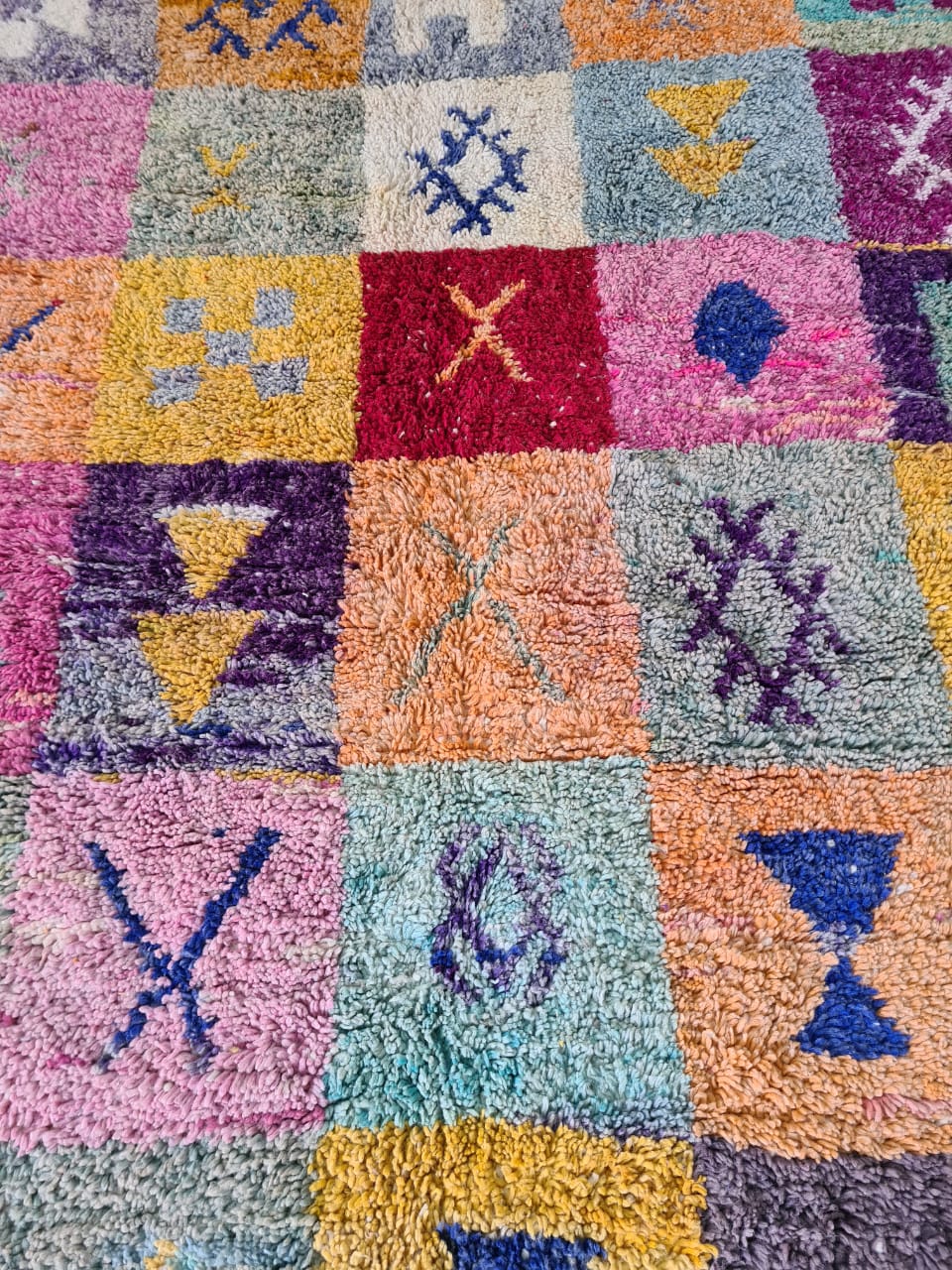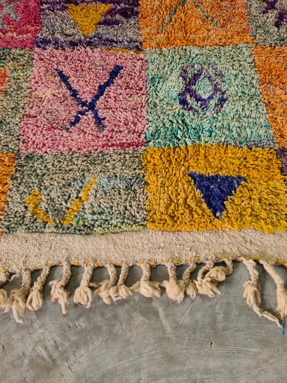 Glyph Garden is a Boujaad talisman rug composed of 42 hand-knotted squares—each a vessel for an Amazigh symbol imbued with ancestral meaning. A meditative chromatic chant, it radiates the ceremonial power of the Middle Atlas, invoking protection, fertility, and sacred direction with every field of color.