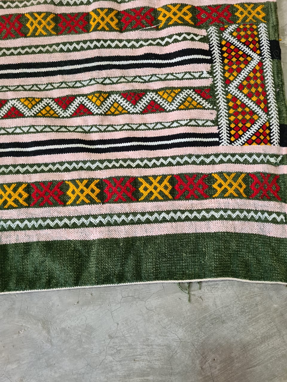 Verdant Verse is a thick and vibrant kilim handwoven by the Zemmour tribes of the Middle Atlas. Unusual in its construction, this piece is crafted in deep green velvet—a bold material choice seldom found in Amazigh weaving—elevating its tactile depth and radiance.