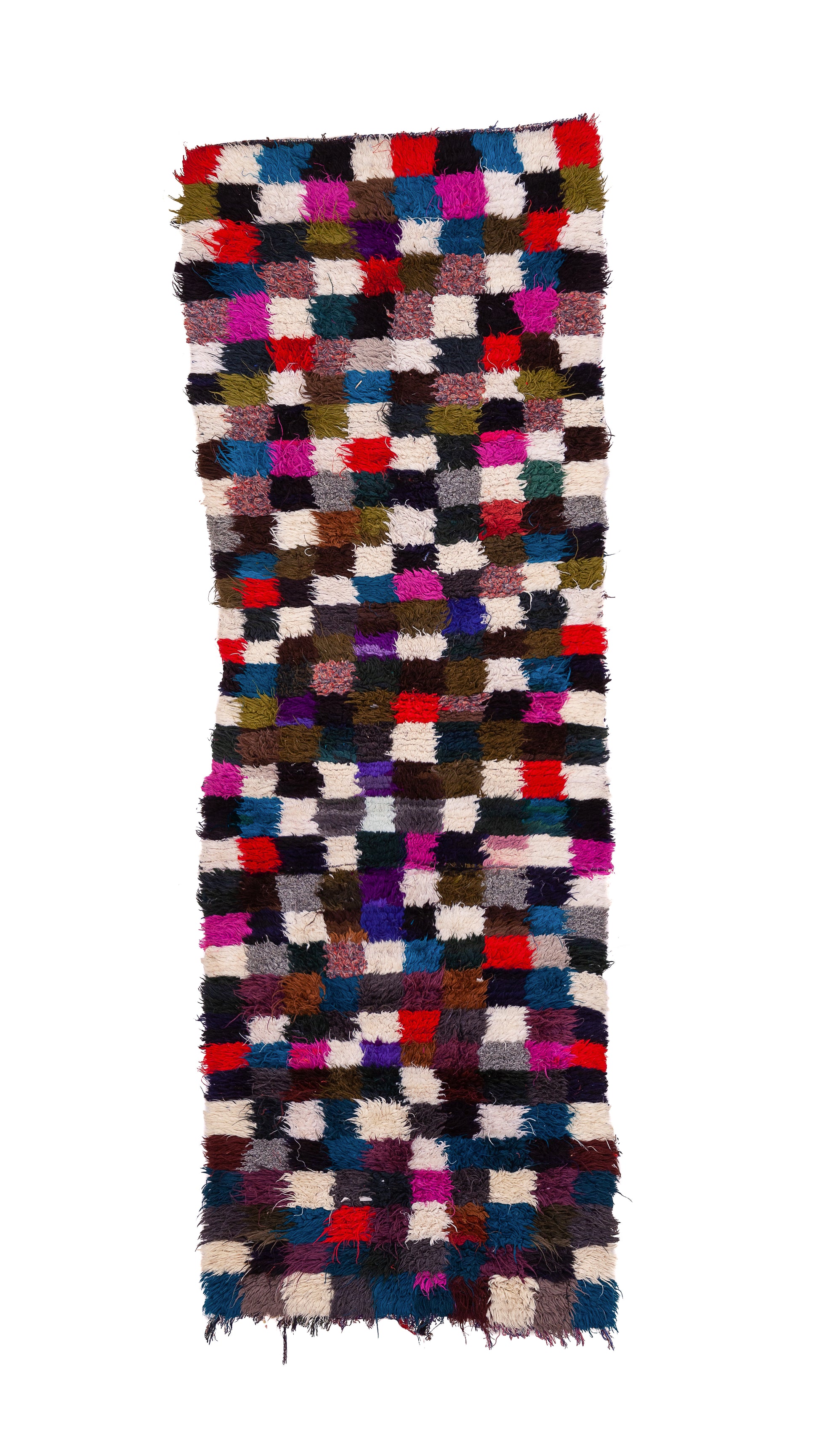 Vivid and plush, this boucherouite runner lays a lively harlequin grid of shaggy color blocks—ink, ivory, fuchsia, cobalt, olive and ember—delivering artful energy for corridors and long sight lines.