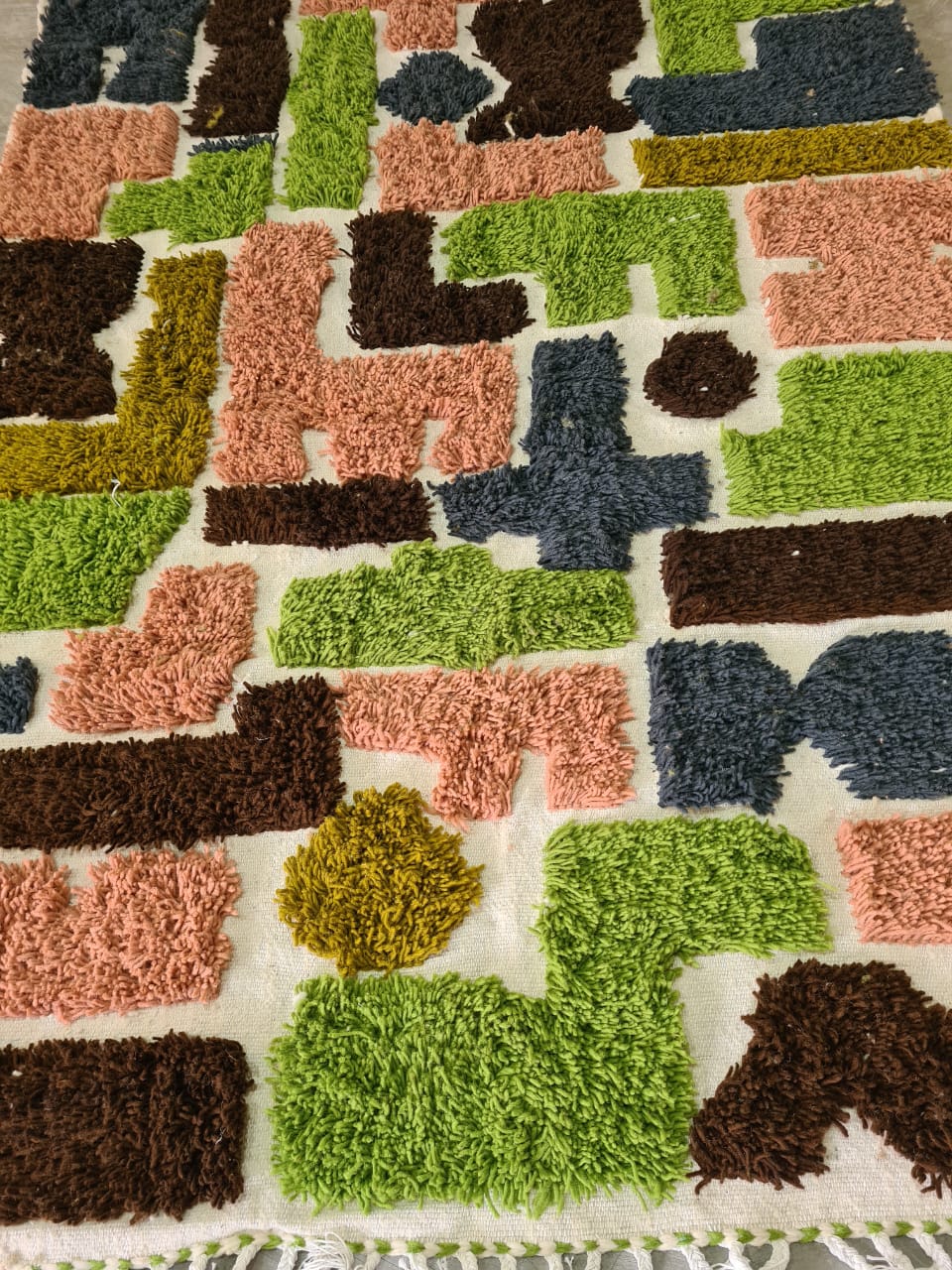 In this tactile composition, raised motifs in rust, rose, and verdant green cascade across an ivory field—resembling garden terraces, streams, and the undulating hills of the Chaouia region. More than a rug, it is an ode to abundance, joy, and feminine creativity.