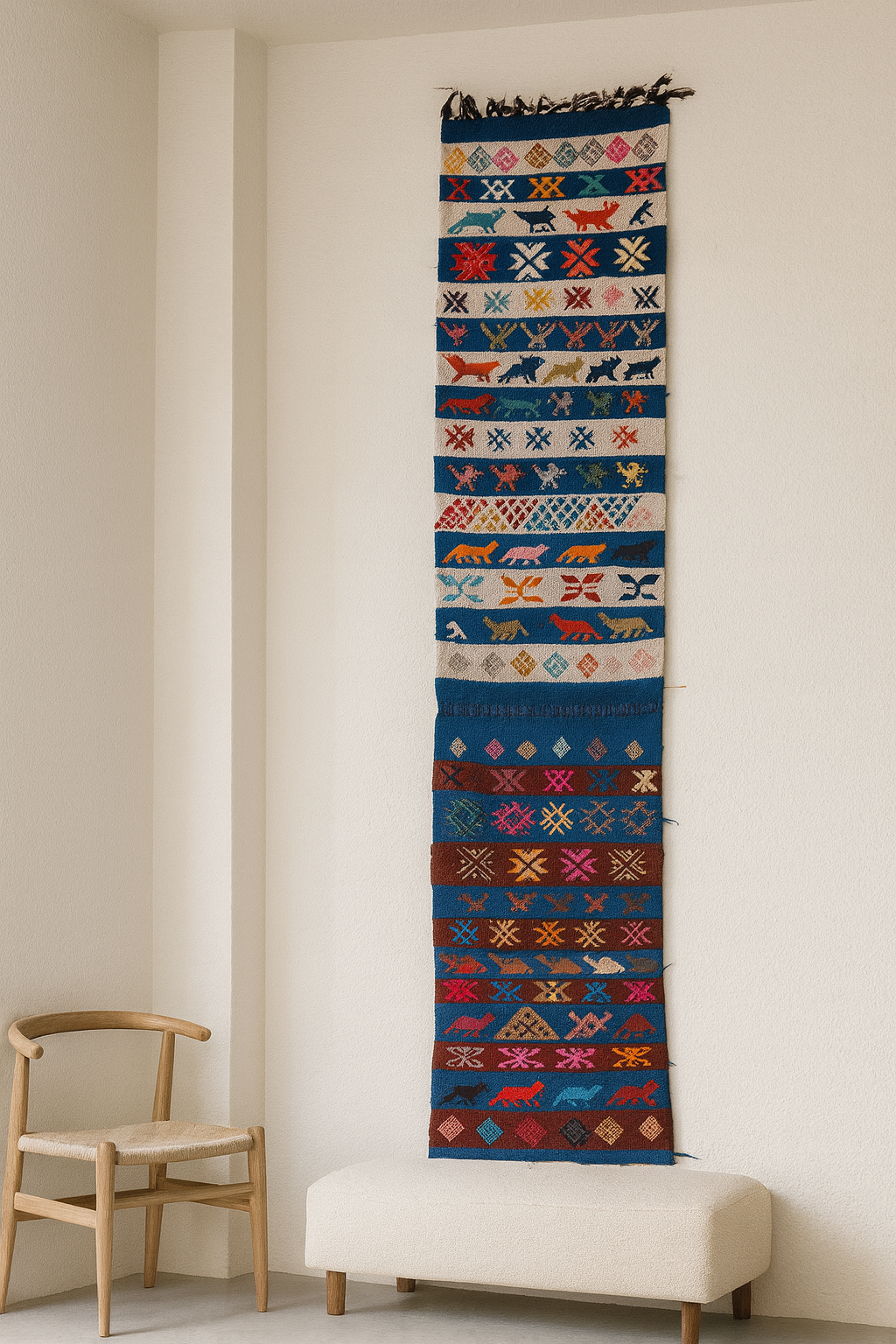 Guardian animals signal protection and abundance; the central lozenges secure lineage and prosperity; repeated X crosses ward the path. The banded cadence evokes journey and safe passage—perfect for hallways.