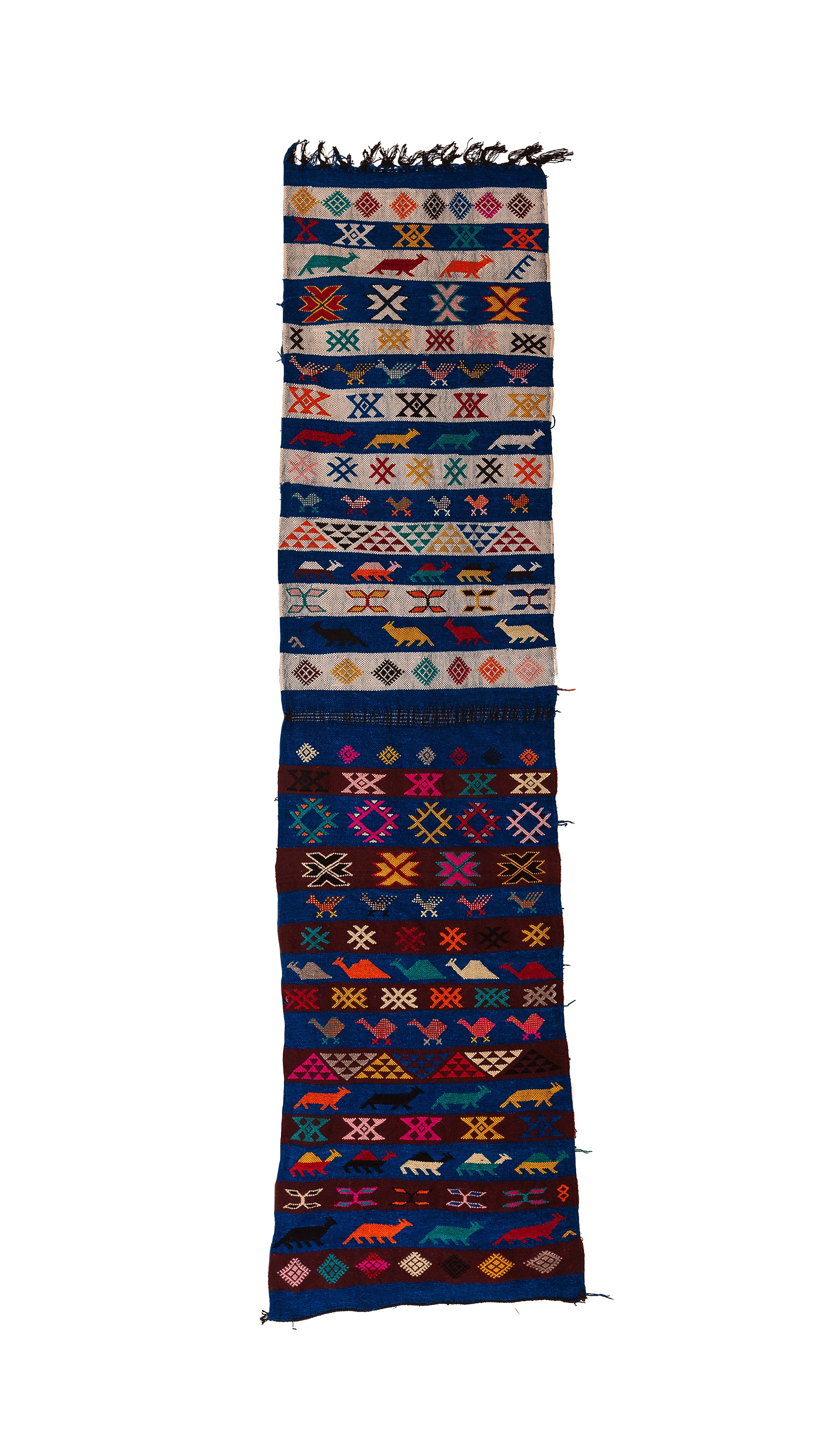 Energetic and ceremonial, this Boujaad runner deploys rhythmic bands of animals, lozenges and crosses across an indigo ground. Handwoven in the Middle Atlas in the traditional moubra technique (flatweave in wool with natural plant-fiber accents), it’s low-profile, door-clearing and built for high-traffic passages.