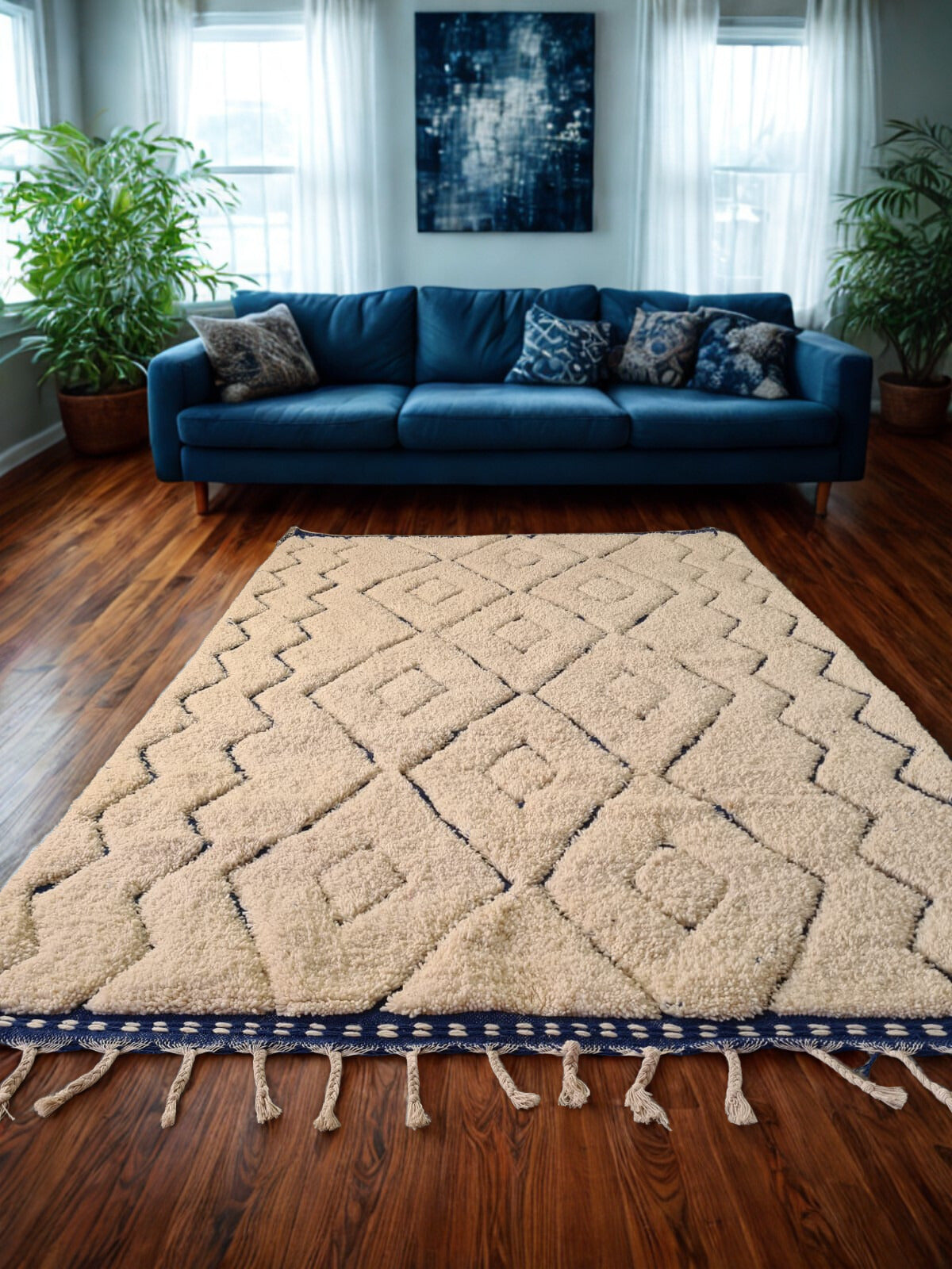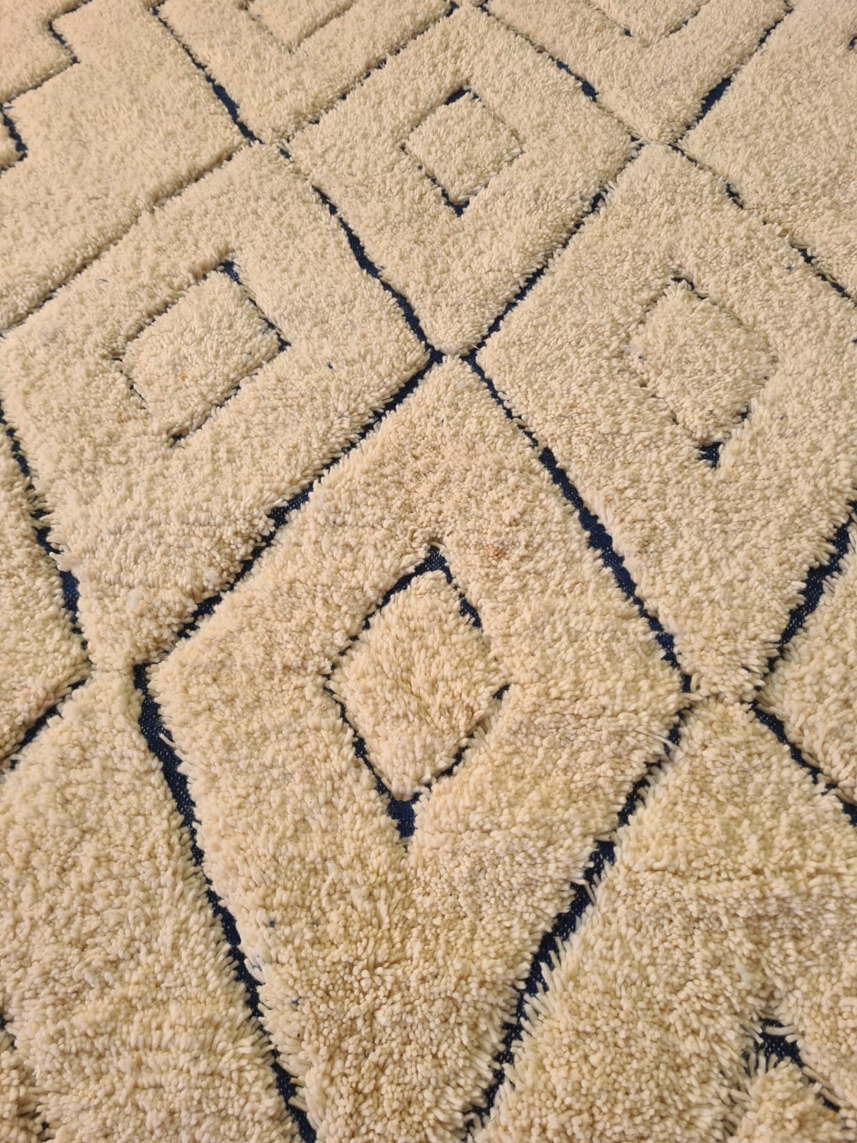 A luminous Azilal woven in undyed ivory wool, articulated with a crisp nested-diamond lattice and anchored by an indigo border band with dotted detailing and hand-twisted fringe. The pile is plush and velvety; scale is ideal for large seating areas seeking warmth with graphic clarity.