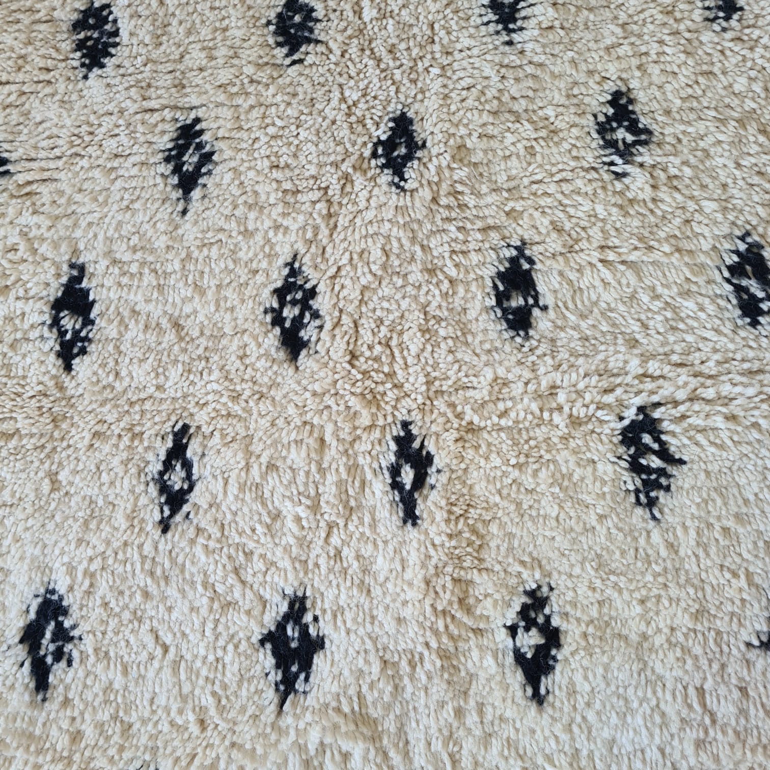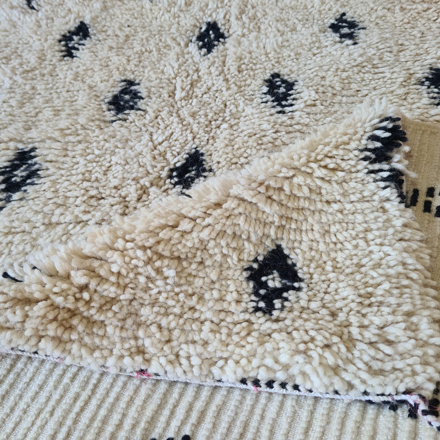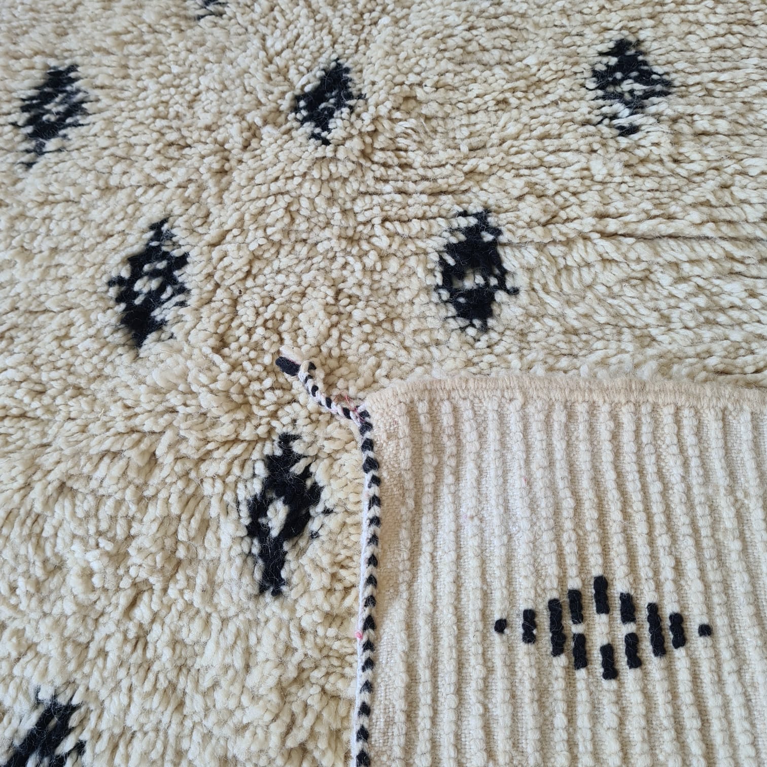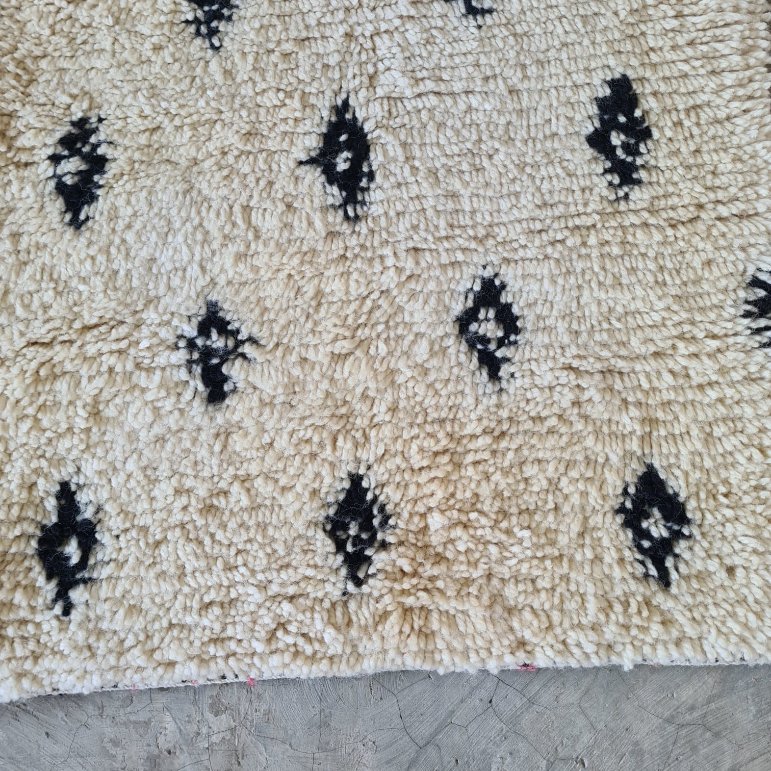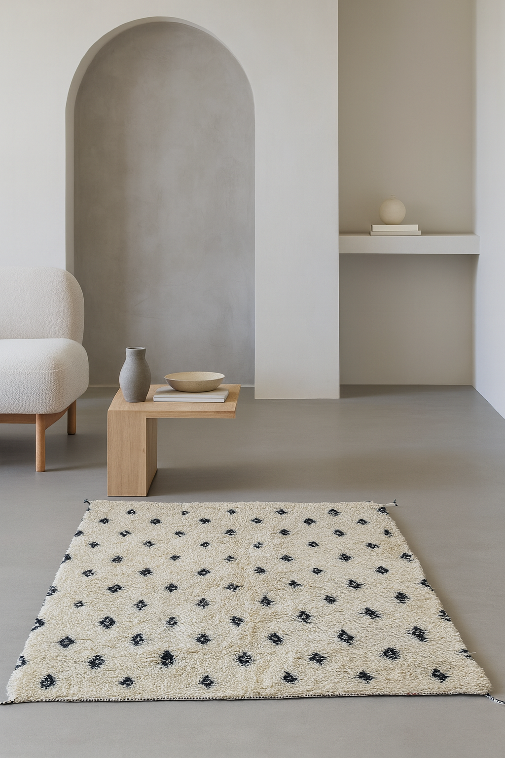 A quiet Marmoucha in undyed ivory wool punctuated by charcoal seed-tufts set on a regular offset. The field is plush and even, finished with bound edges for a clean, contemporary profile—easy to place, soft underfoot.