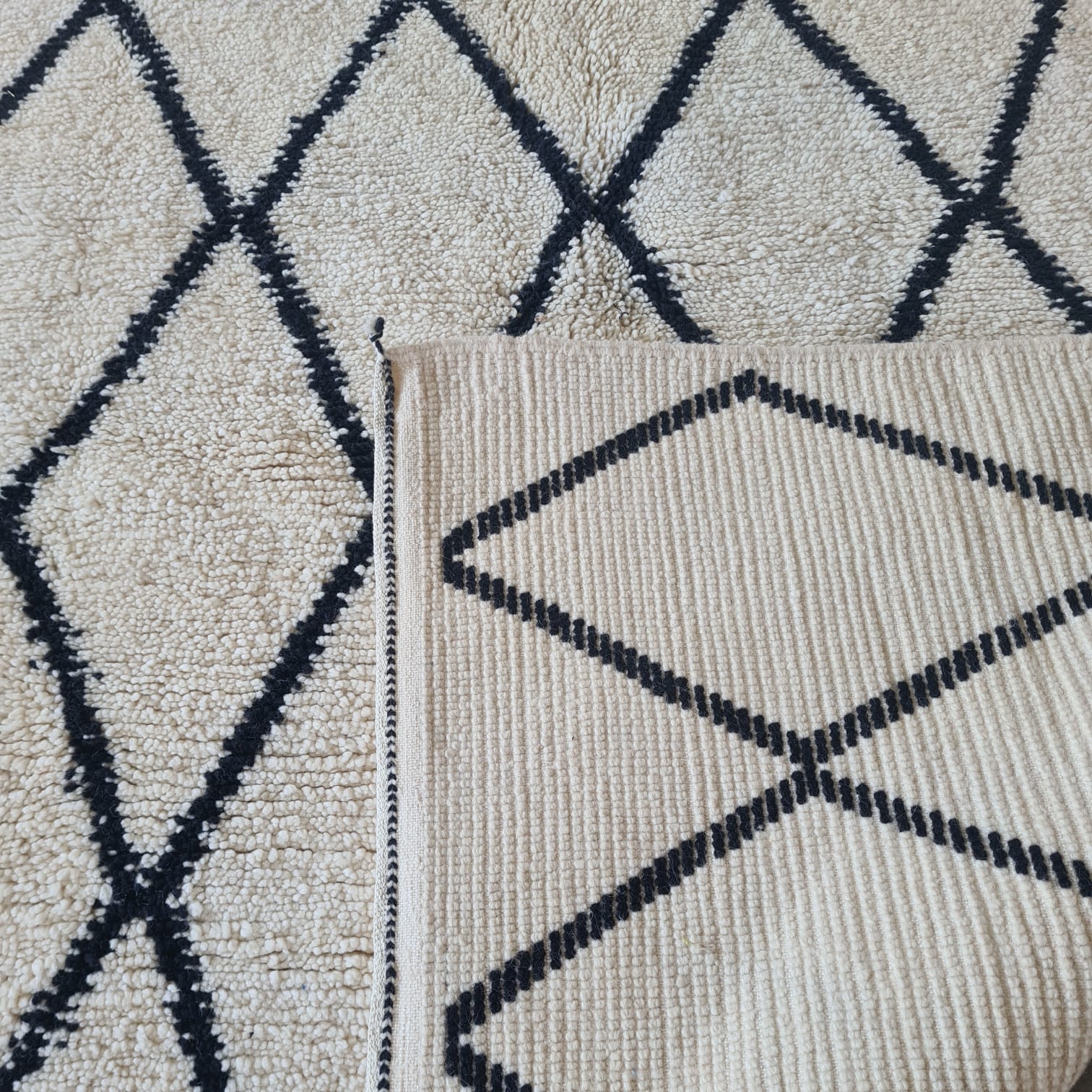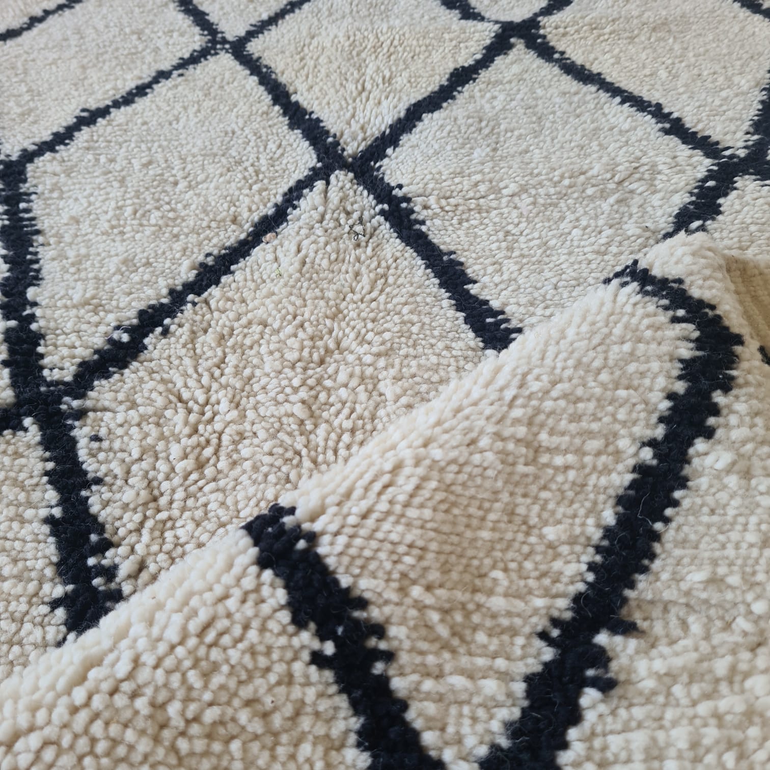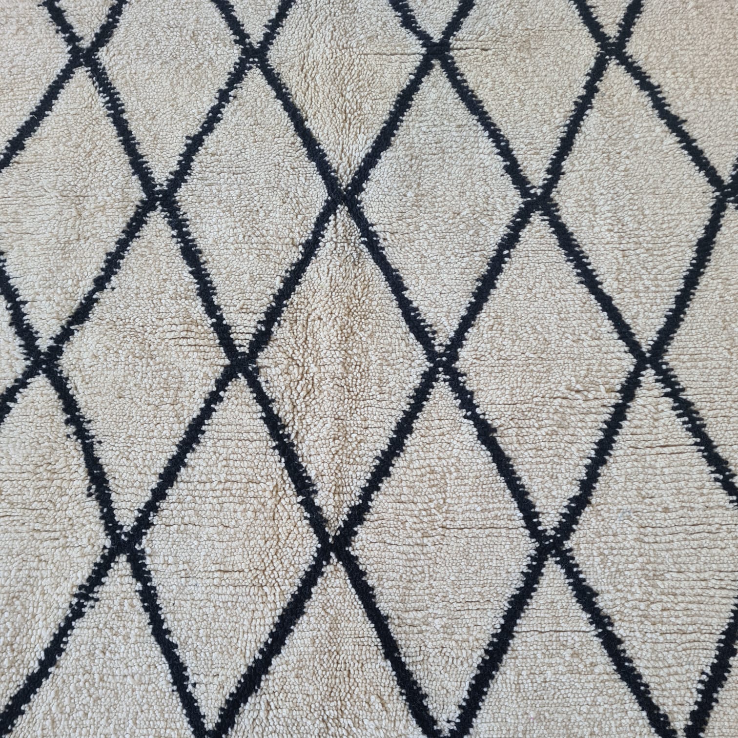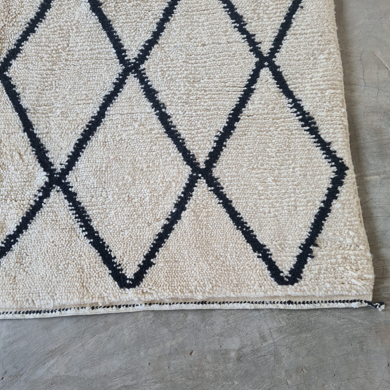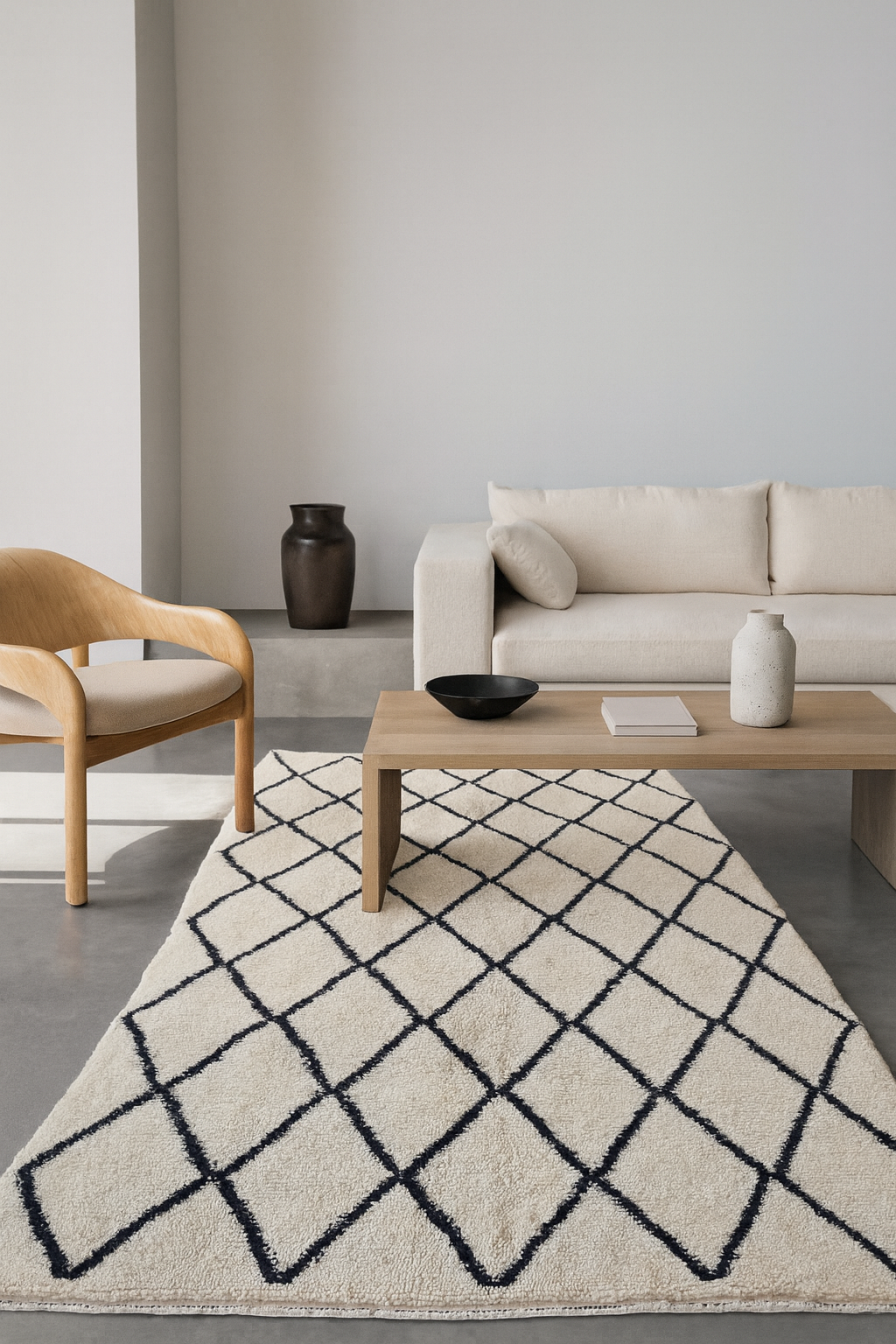 A refined Marmoucha woven in undyed ivory wool with a crisp charcoal diamond lattice. The drawing is clean and airy, creating generous negative space over a plush, even pile. Finished with short flatweave aprons and natural fringe— minimal, architectural, and soft underfoot.