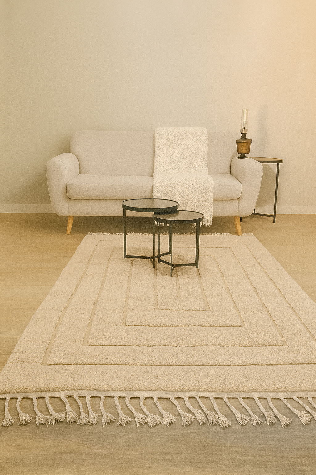 Tone-on-tone modernism: concentric “stepped” rectangles are carved into a plush ivory field, creating a subtle high–low relief that reads serene and architectural. Quiet luxury with unmistakable Amazigh hand.