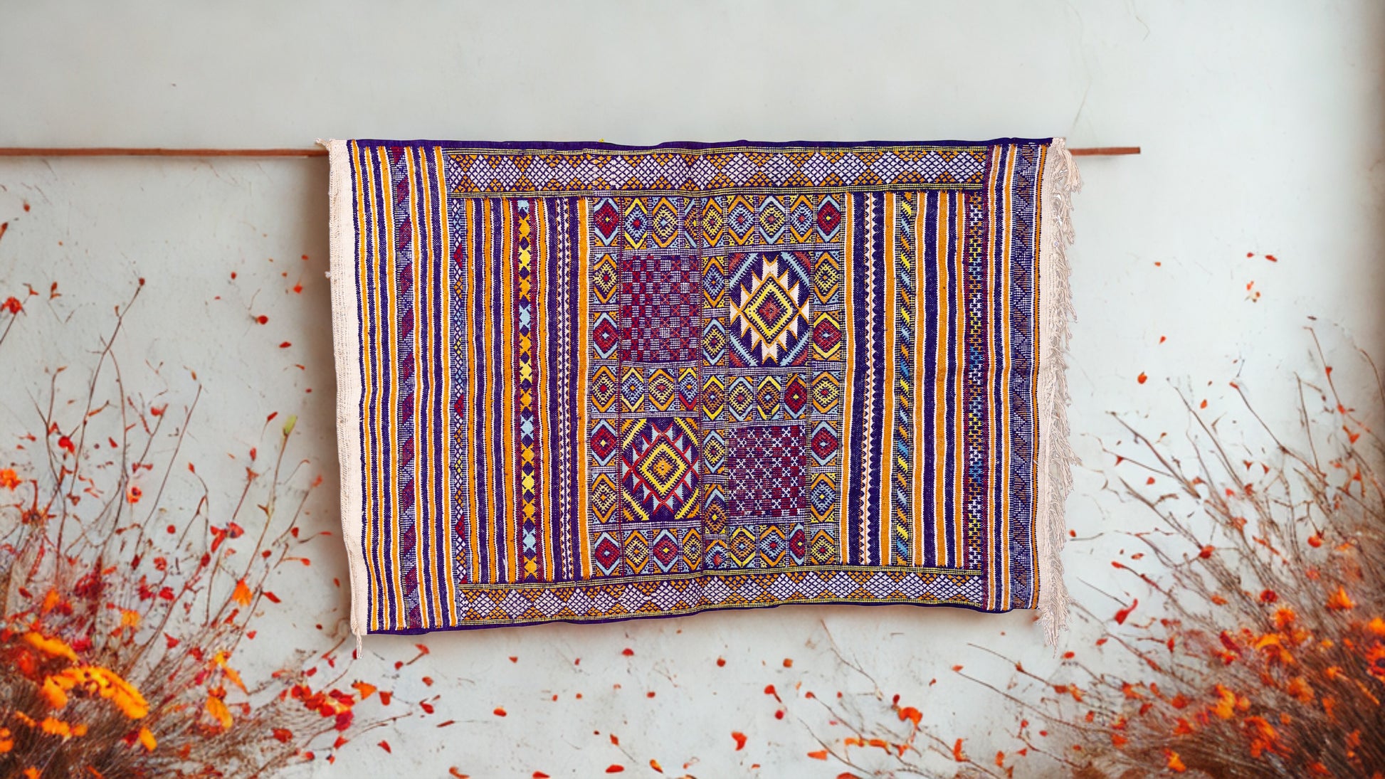 Hand-woven hanbel (flatweave) in the Amazigh tradition with brocaded motifs. Smooth, durable handle; lies flat with graceful drape.
