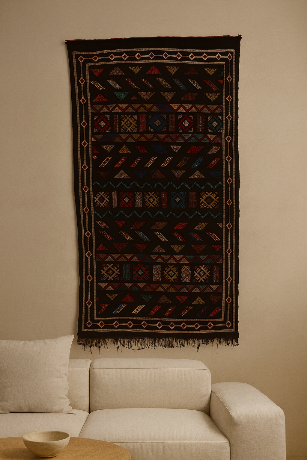 Architectural and richly coded, this Boujaad flatweave sets an onyx ground inside diamond-guard borders, banded with checker ledger panels, serrated chevrons and zigzag water lines. Handwoven in the Middle Atlas in the traditional moubra technique (flatweave in wool with natural plant-fiber accents), it reads crisp and modern with a low, door-clearing profile built for daily living.