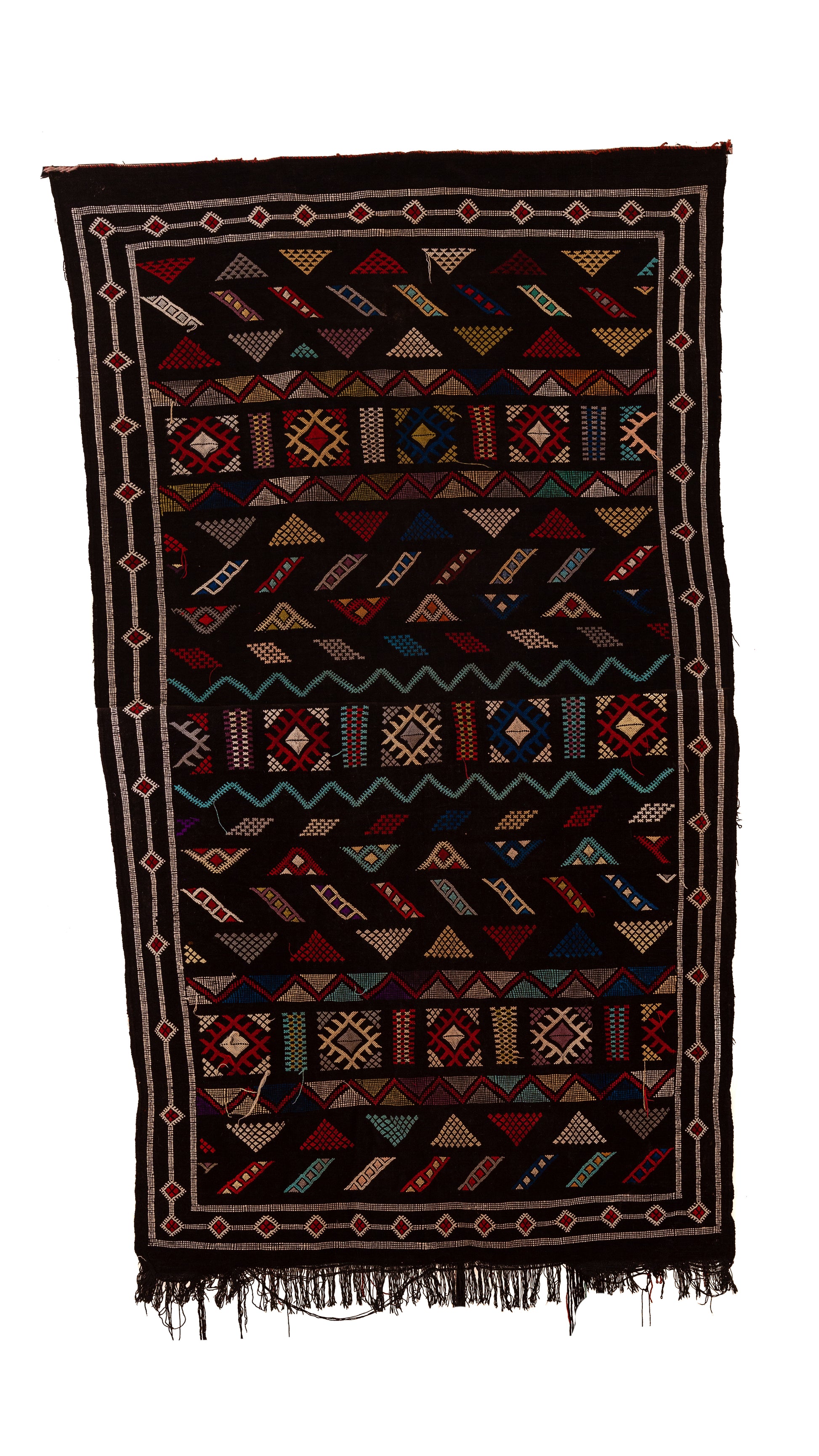 - Structure: Kilim (flatweave) with brocaded motifs; moubra technique