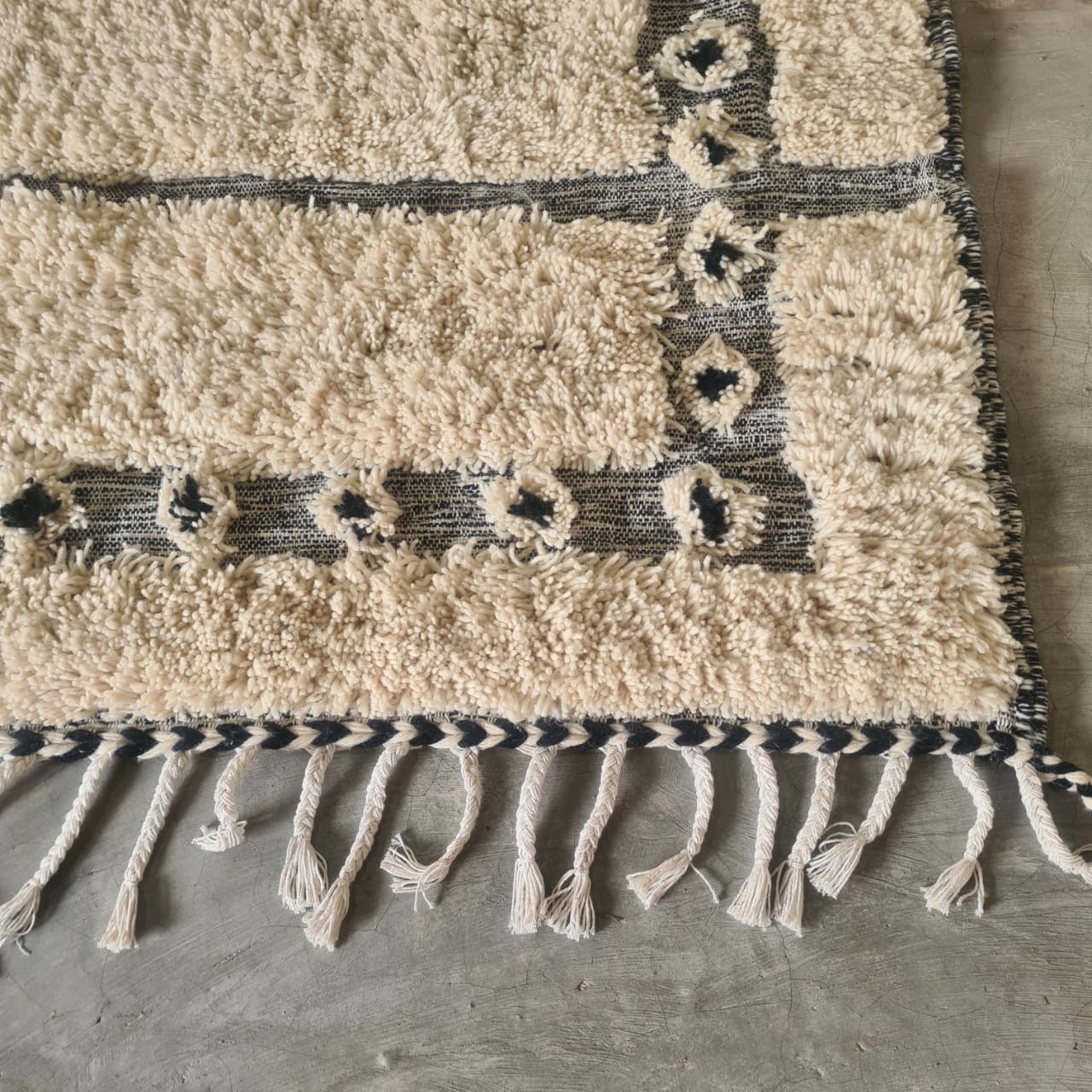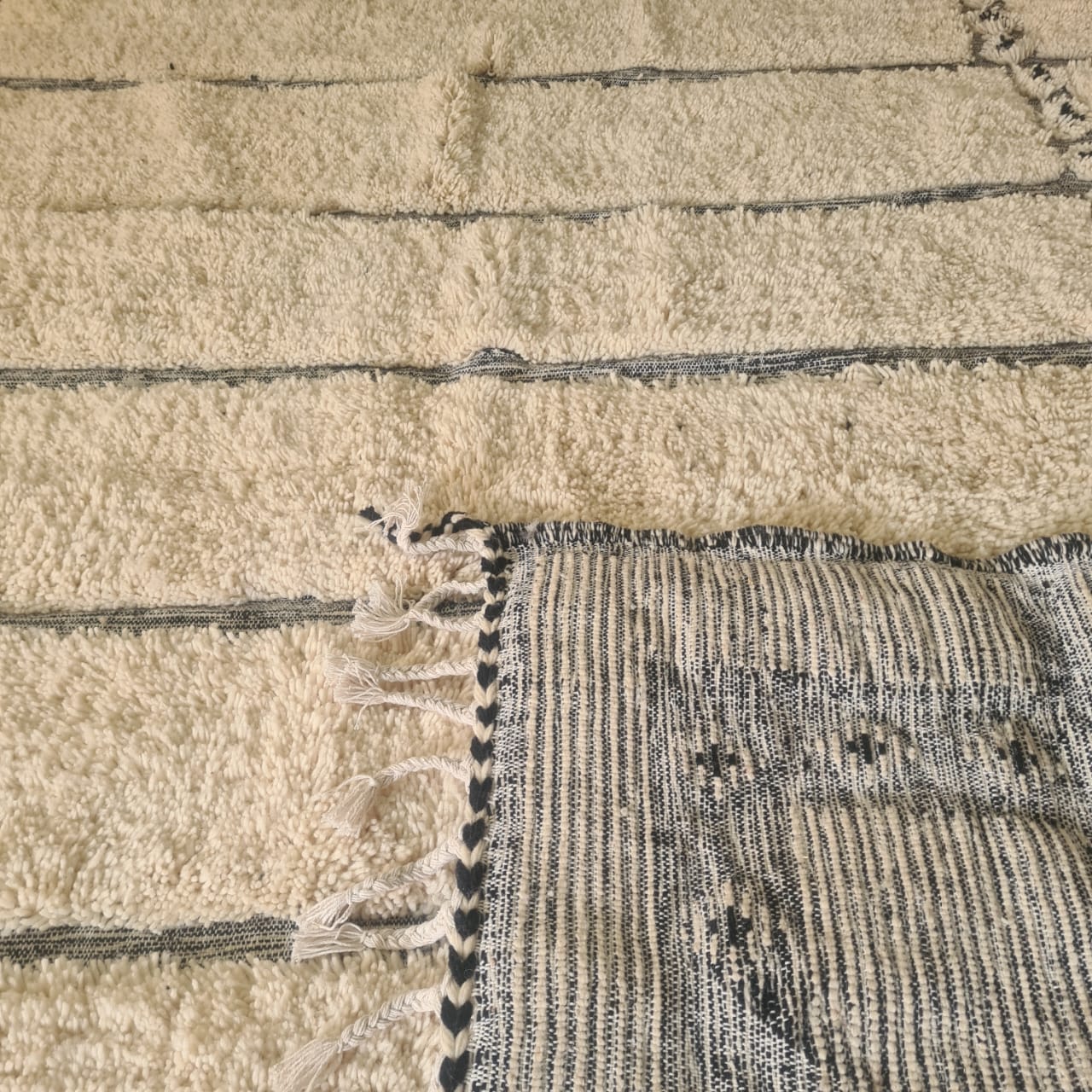 A refined Beni Ourain in undyed ivory wool featuring subtle horizontal ladder bands across the field and a sculptural knotwork border in slate/indigo tones. Plush, velvety pile; braided selvedge details; and long, hand-twisted fringe deliver a quietly dramatic, authentically Atlas finish at room scale.