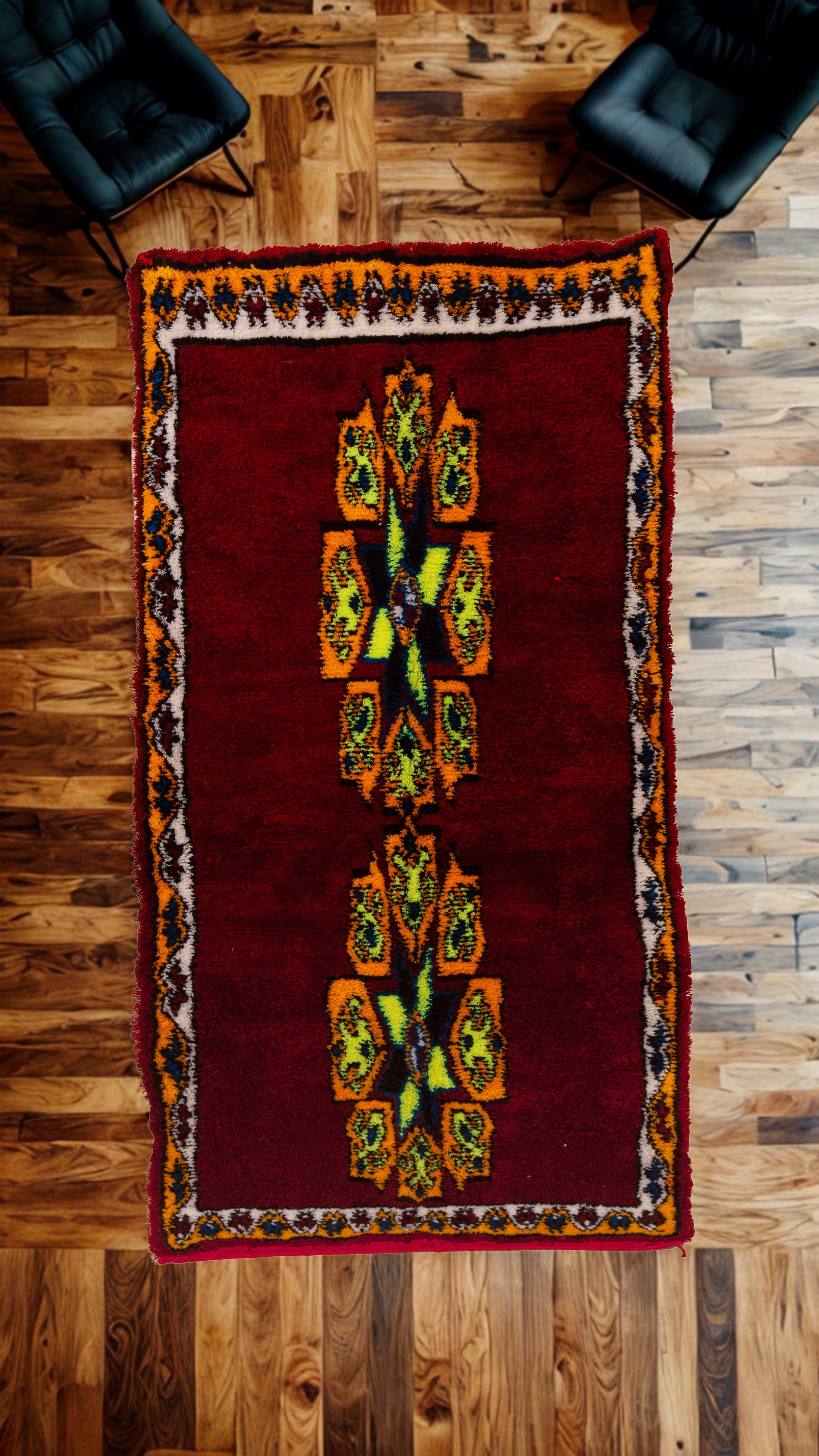Middle Atlas Zayane pile rug in the classic kubba idiom: a deep madder field anchored by a vertical chain of shrine-like medallions in saffron, chartreuse and indigo. A flame–border frame with ivory guard lines finishes the composition. Dense, cushioned handle; compact room size.