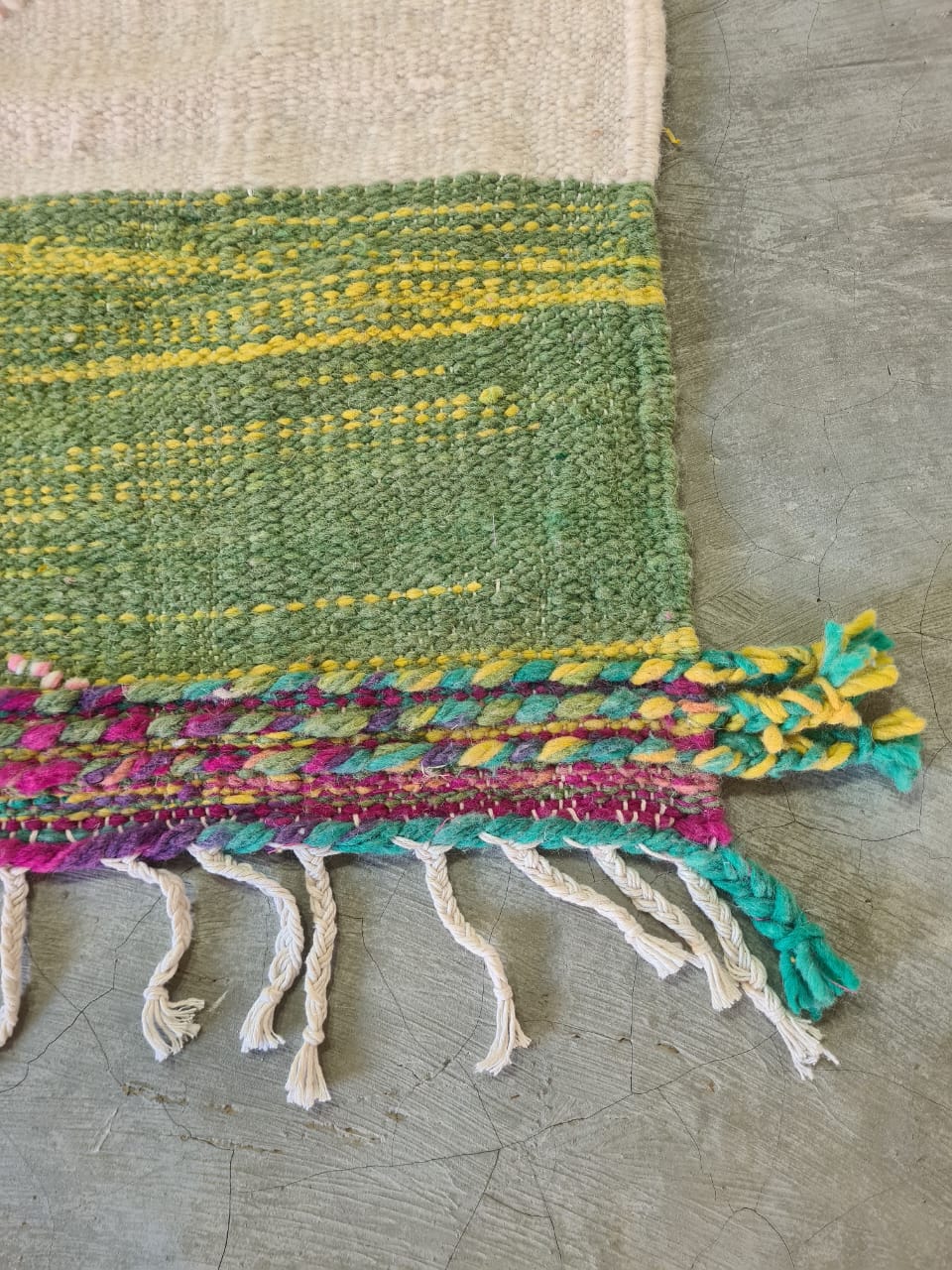 Drawing inspiration from landscape, rhythm, and color theory, this piece dissolves geometric control in favor of movement and painterly spontaneity. It’s woven in pure wool with dyed wefts in vivid green, magenta, ochre, lavender, and celadon—blended with intervals of neutral ground for balance.