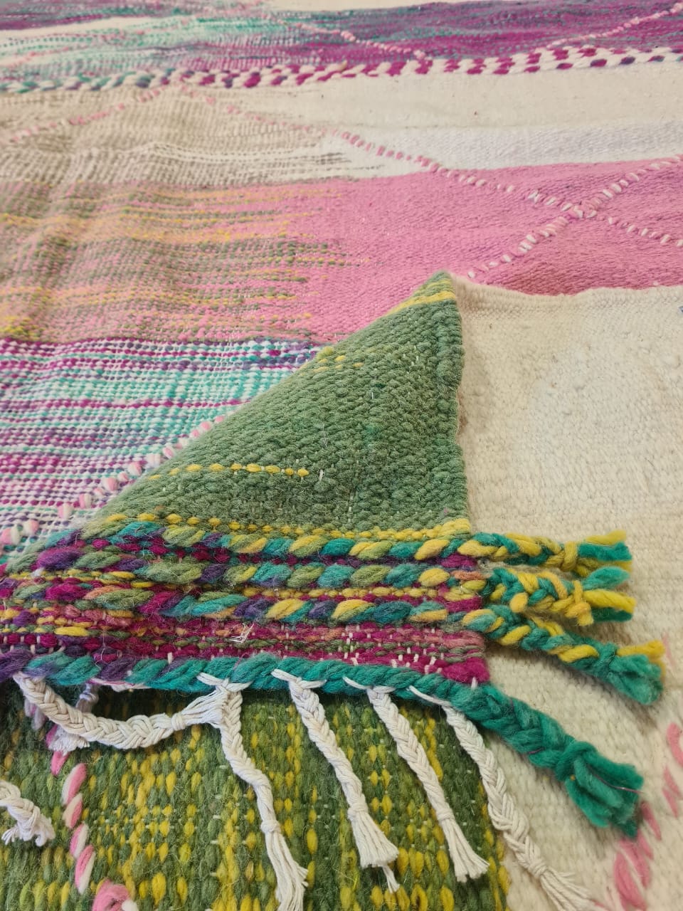 Threadscapes is a contemporary Zanāfi kilim that reinterprets tribal weaving into expressive, chromatic abstraction. Handwoven in the southern plains of Morocco, this lightweight flatweave breaks the conventional mold with its playful lines and fragmented fields of vibrant color.