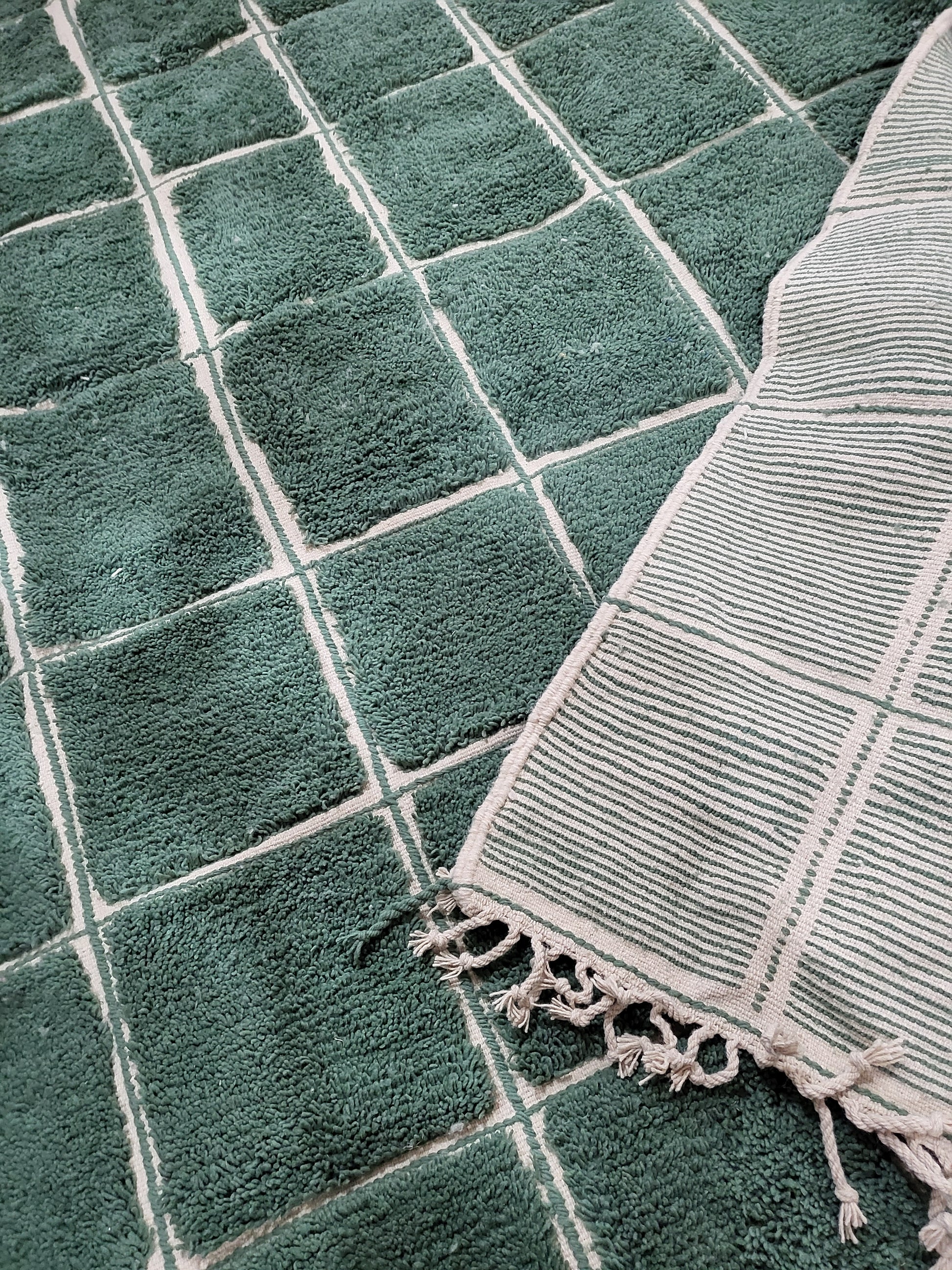 A contemporary Marmoucha statement rug defined by a deep, verdant green field articulated through an ivory grid of subtle raised channels. The composition evokes architectural floor plans and minimalist textile maps— a modern evolution of Marmoucha’s historic emphasis on structure and texture.