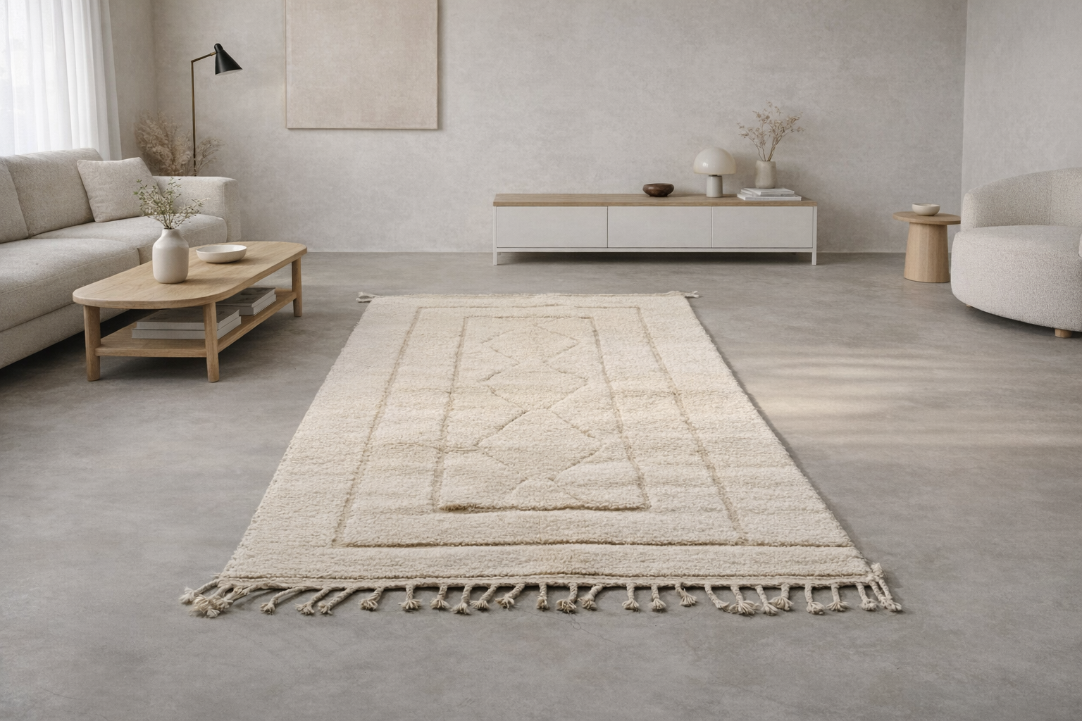 The central diamond chain emerges subtly from the wool surface, framed by a double-border structure that creates a sense of quiet symmetry. The palette remains entirely natural, allowing the wool’s organic luminosity to define the space. This piece is ideal for living rooms, bedrooms, and minimalist interiors seeking warmth without visual weight.
