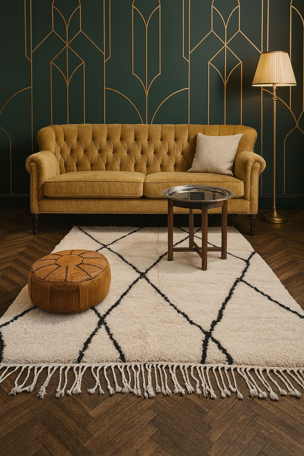 - Pairs seamlessly with oak, linen, boucle, and matte-black accents; ideal under a 3-seat sofa or queen/king bed foot.