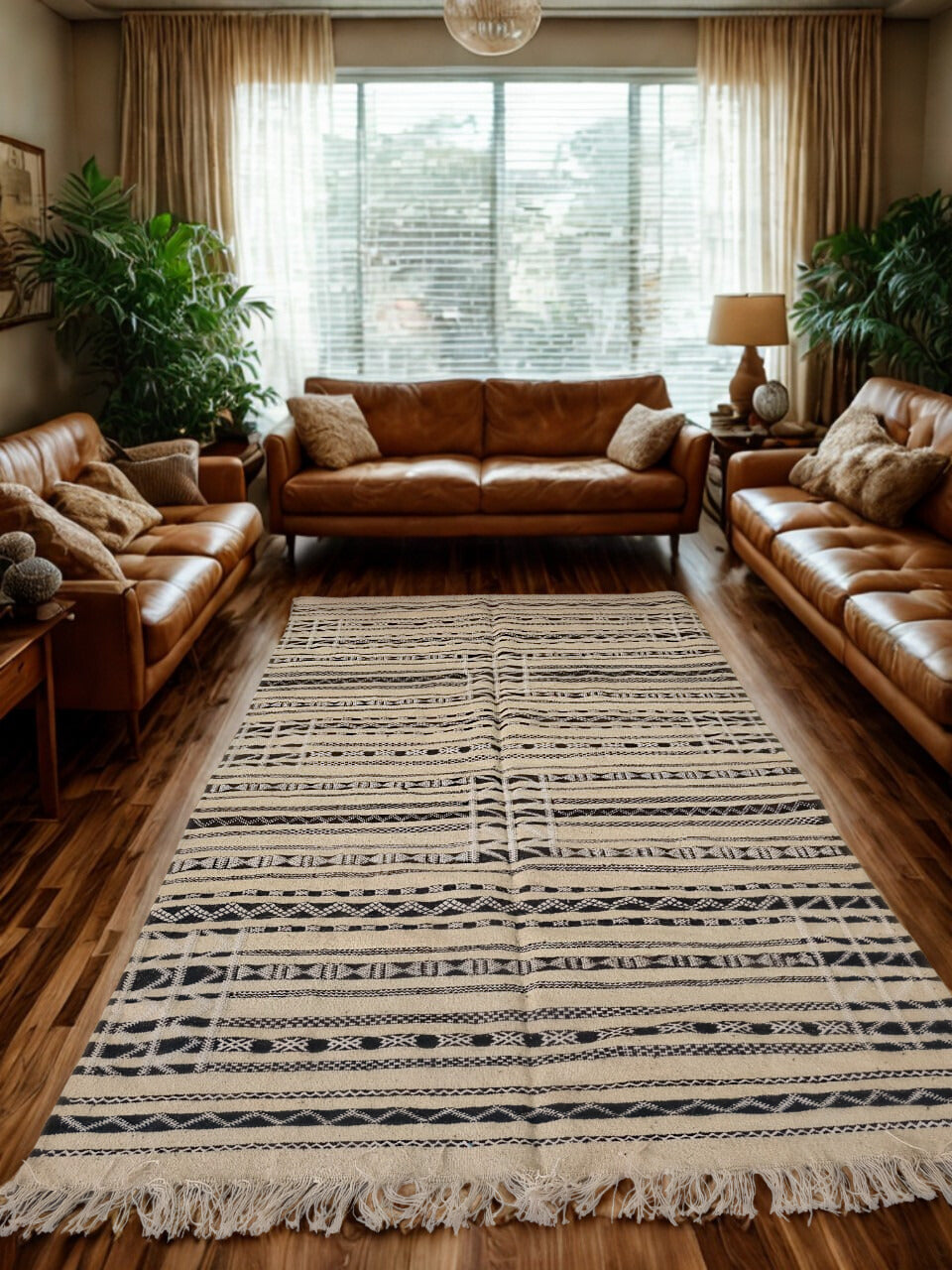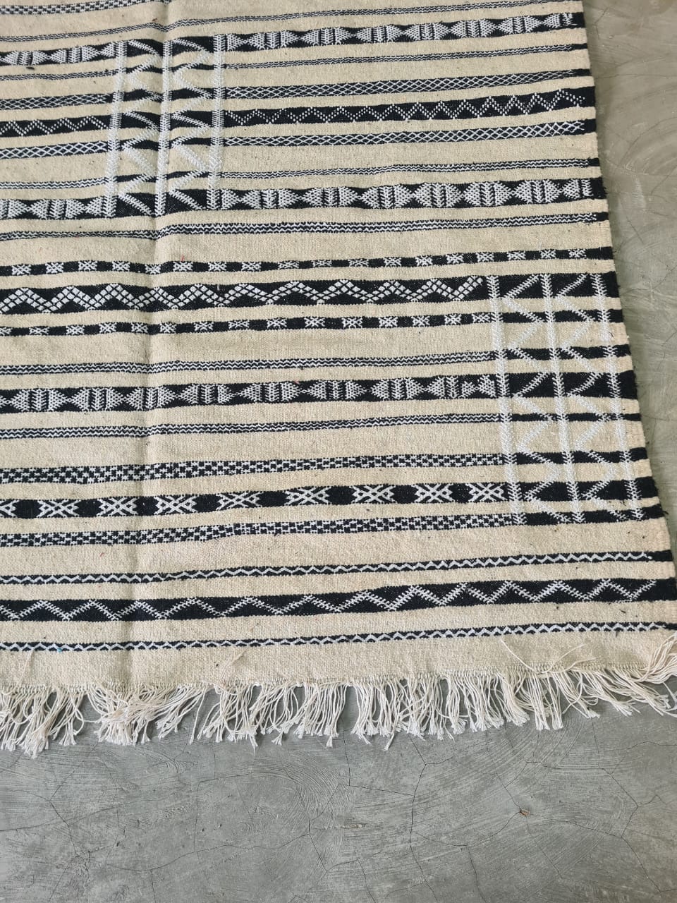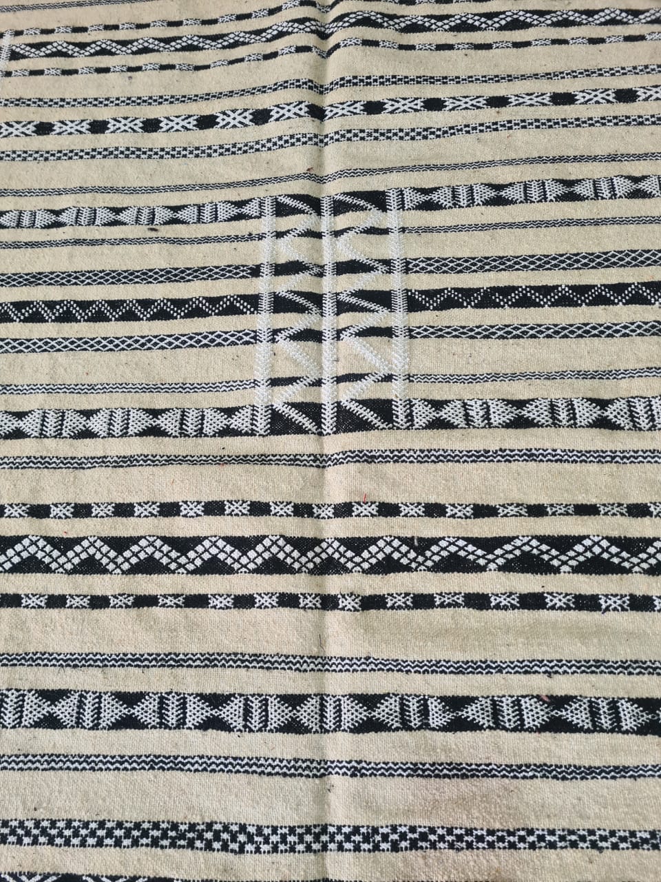 With a whisper of the Sahara and a heartbeat of symmetry, "Desert Script" is a minimalist Zemmour kilim that distills ancient Amazigh codes into a pure monochrome language. Handwoven using traditional flatweave techniques, its ivory and black composition creates a rhythmic cadence—horizontal bars, dotted chevrons, and interlocking diamonds that together form a sacred geometry of balance and space.