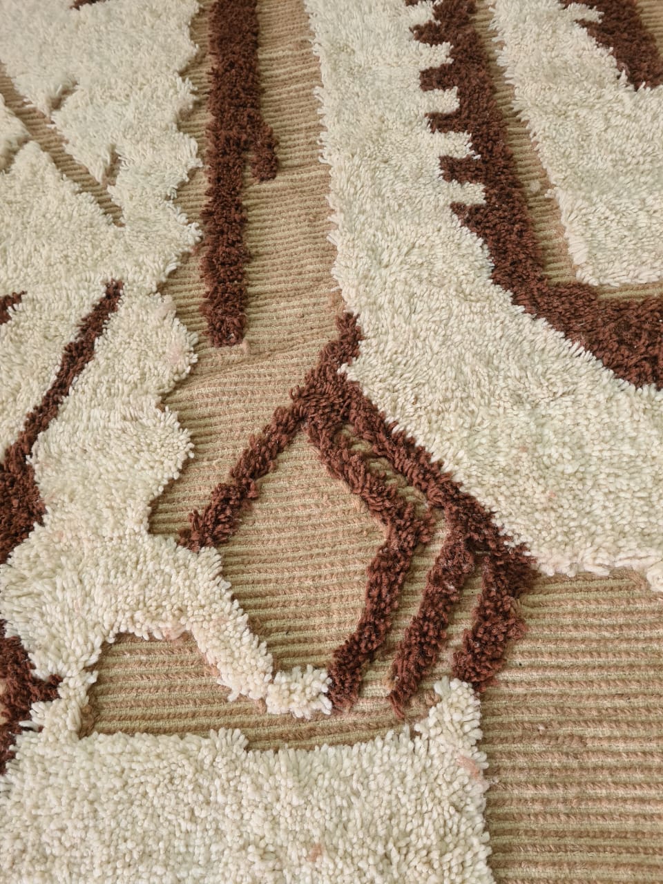 This rug is an original sample from our weaving workshop. Every stitch is handcrafted using undyed or plant-dyed wool sourced from the Atlas. The motifs, symbols, and size can all be reimagined to reflect your own vision.