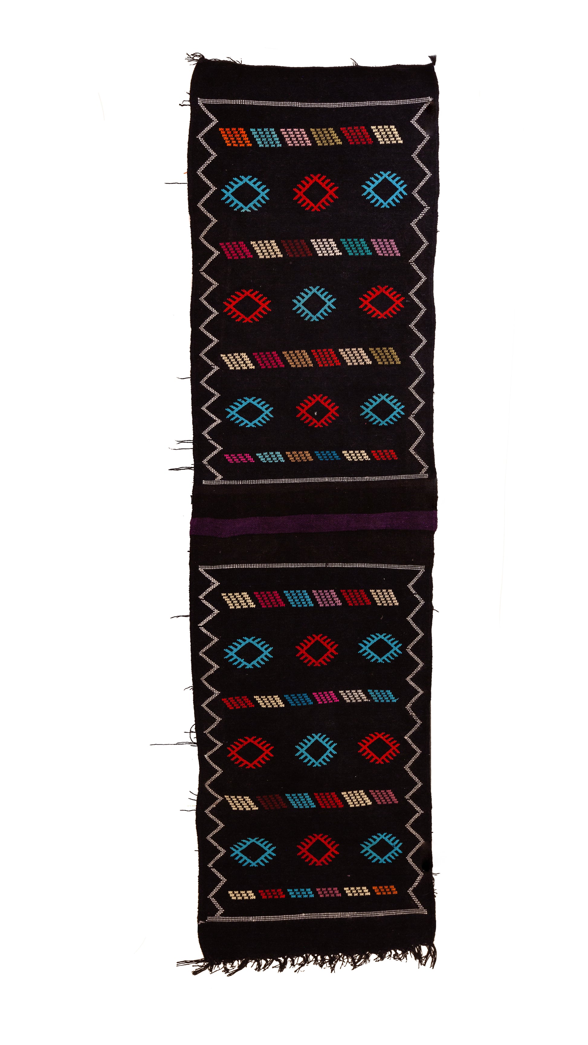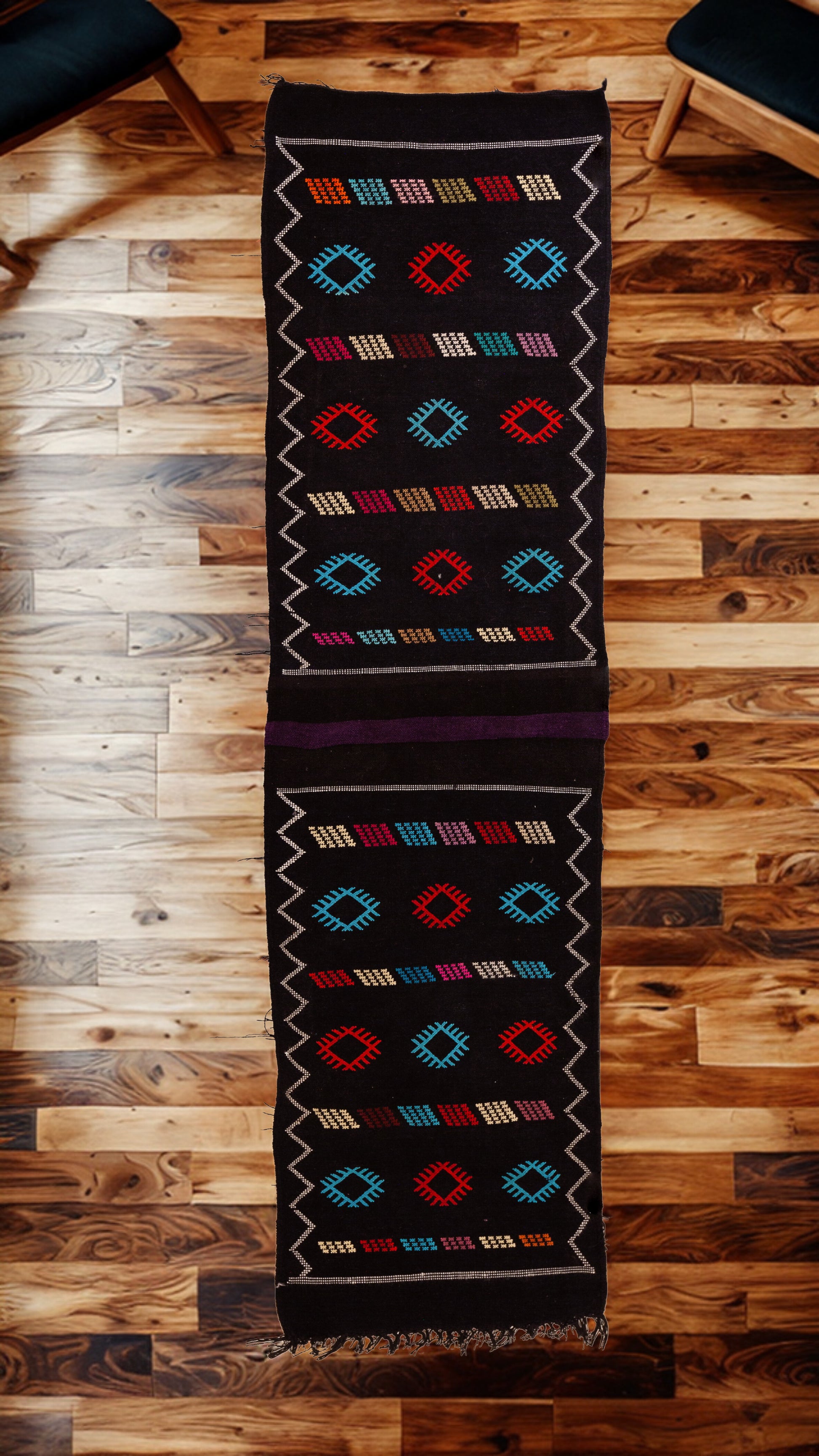 Repeating lozenges signal protection, fertility and wayfinding, while the zigzag sserghina borders act as guardians of the path. Energetically grounding with a forward-motion cadence—ideal for transitional spaces.