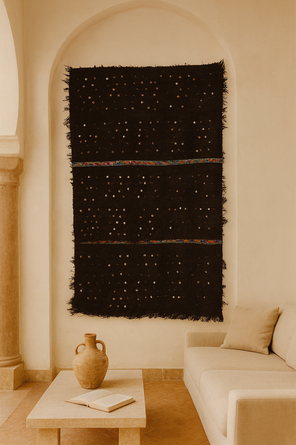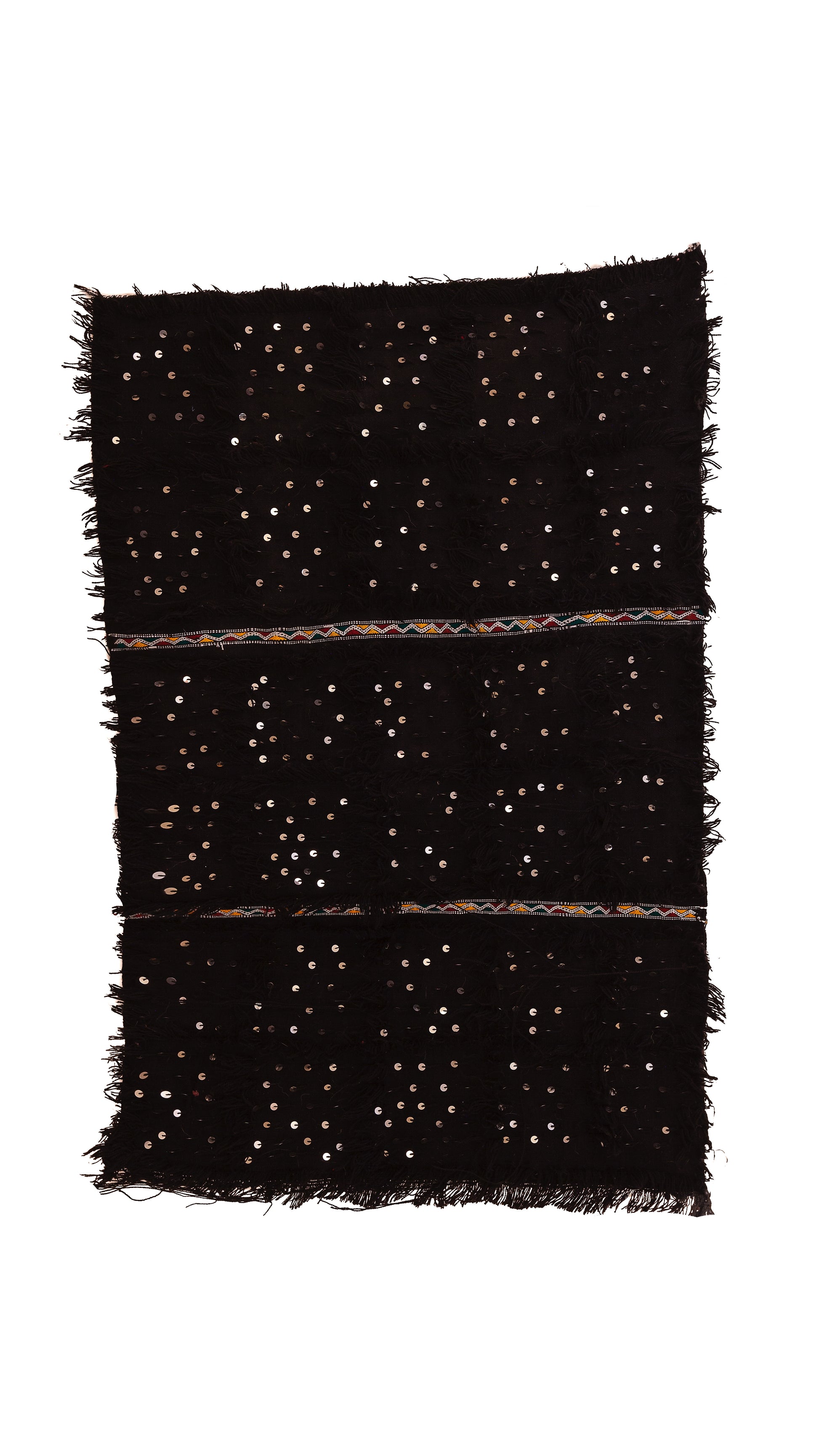Atmospheric and ceremonial, this Zayane kubba presents an inky black wool ground scattered with shimmering sequins and crossed by two multicolor bands—an heirloom textile that reads like starlight on night sky. Traditionally worn or used in rites, it now makes a striking wall hanging or accent rug.