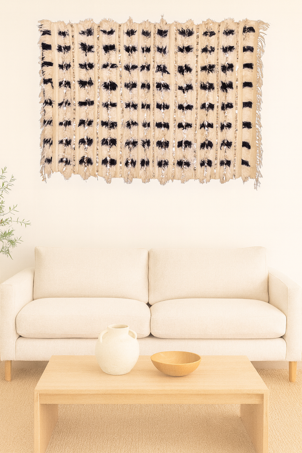 A luminous Beni Ourain Handira (wedding blanket) in cream, structured by vertical tufted columns. High-contrast ebony knots and scattered sequins animate the surface—an auspicious textile historically worn by the bride to invoke protection, blessing, and joyful abundance.