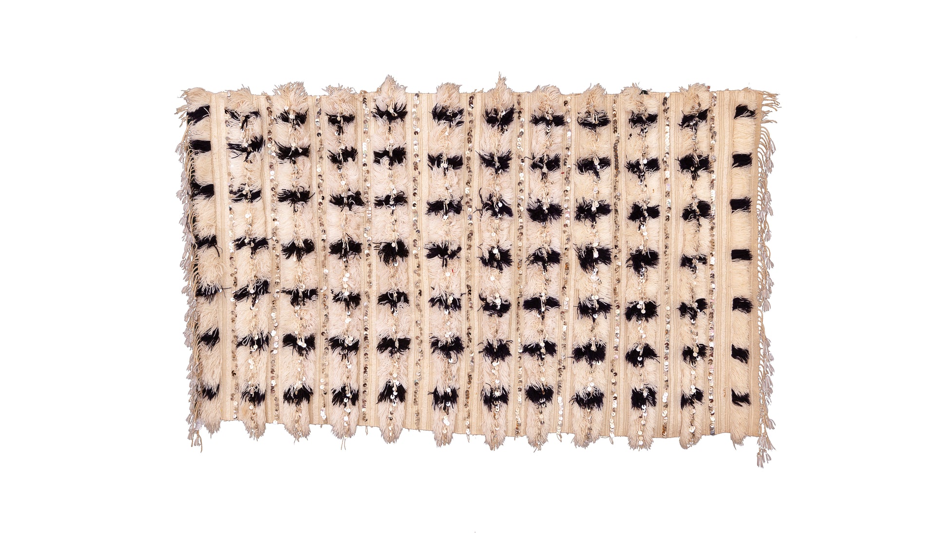 Hand-woven flatweave with ribbed ground; hand-applied sequins (mouzouna) and plush tuft accents. Supple drape with gentle, tactile shimmer.