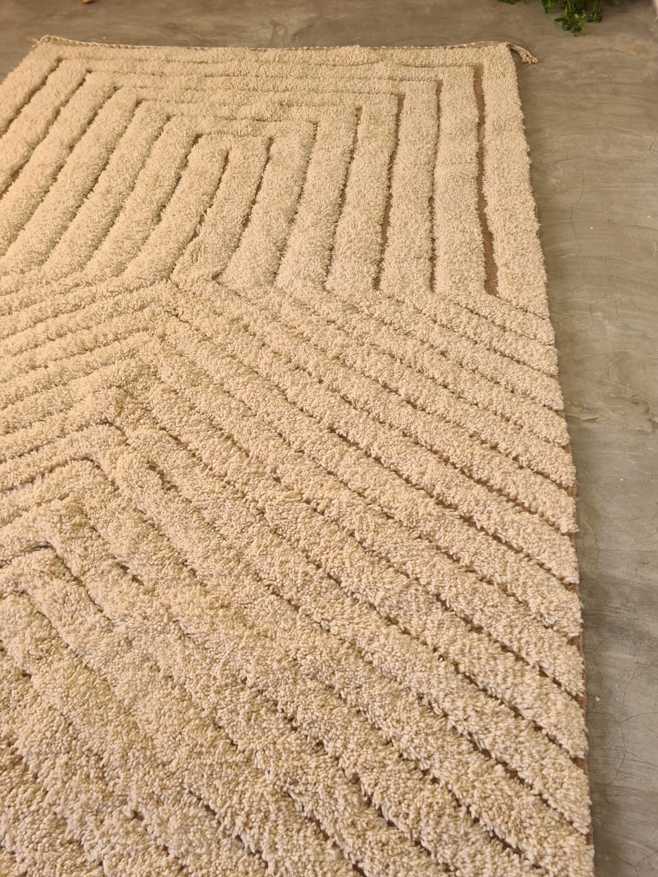 Echo Lines is a minimalist Beni Ourain rug that reinterprets ancient symmetry through contemporary relief. Handwoven in the High Atlas Mountains using the softest undyed wool, its design speaks through texture rather than motif.