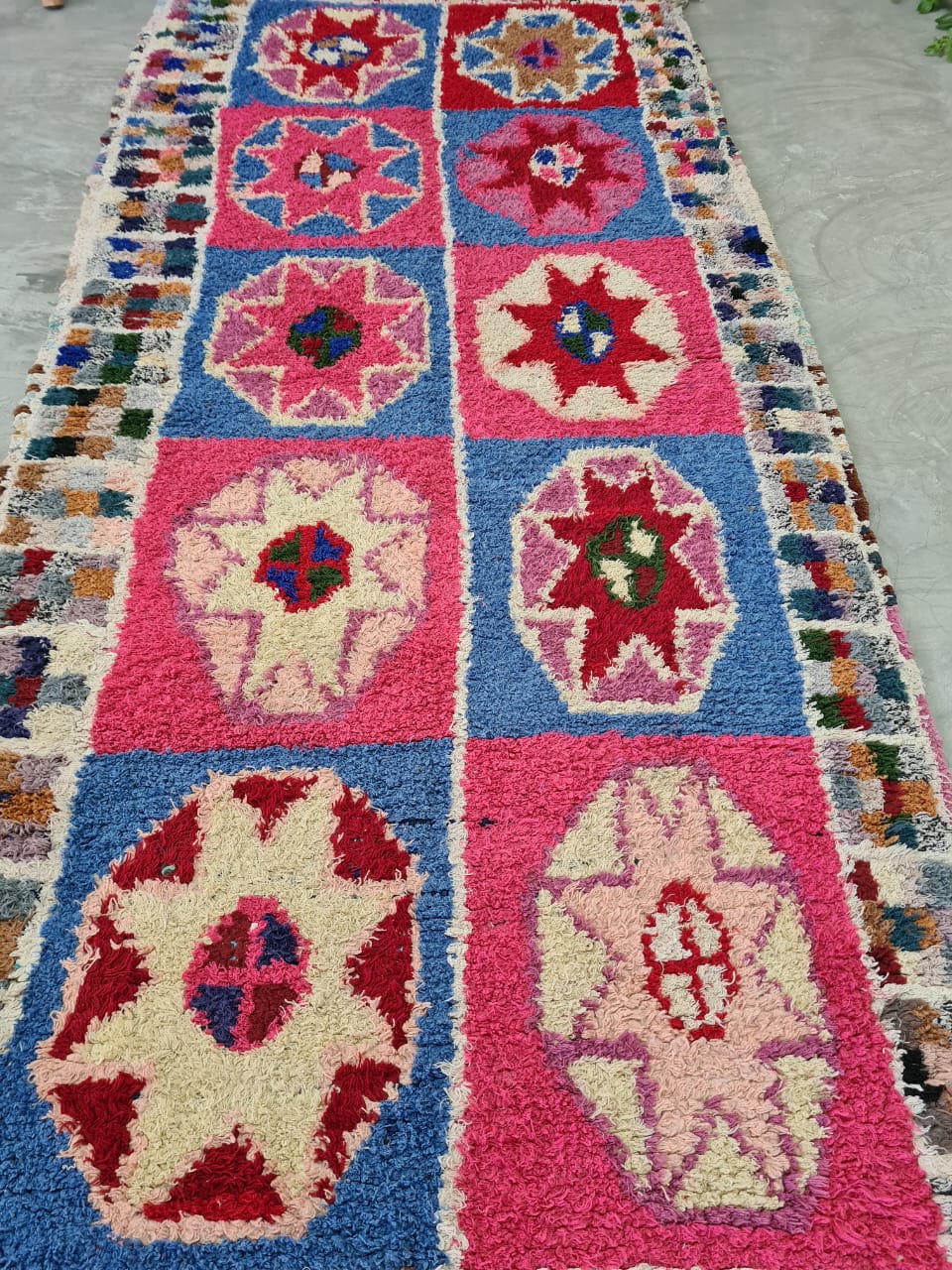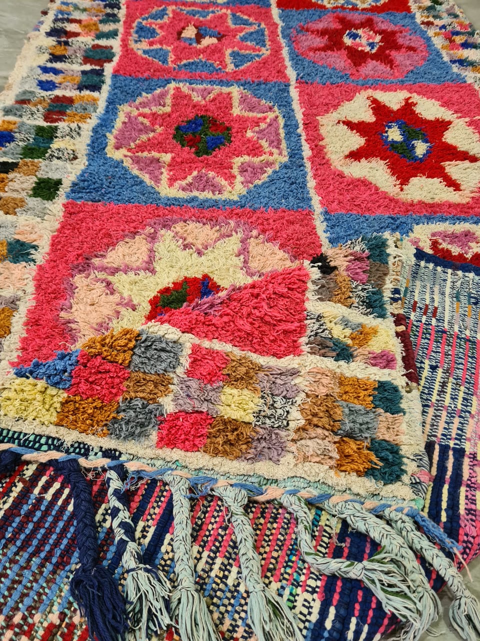 "Crimson Frequency" is a radiant example of the Boucherouite tradition—crafted from recycled household fabrics and composed through instinct, rhythm, and an explosion of color. Its bold central medallions, nested in saturated reds and electrified by cyan and ivory accents, evoke the vibrational frequency of music, memory, and motion.