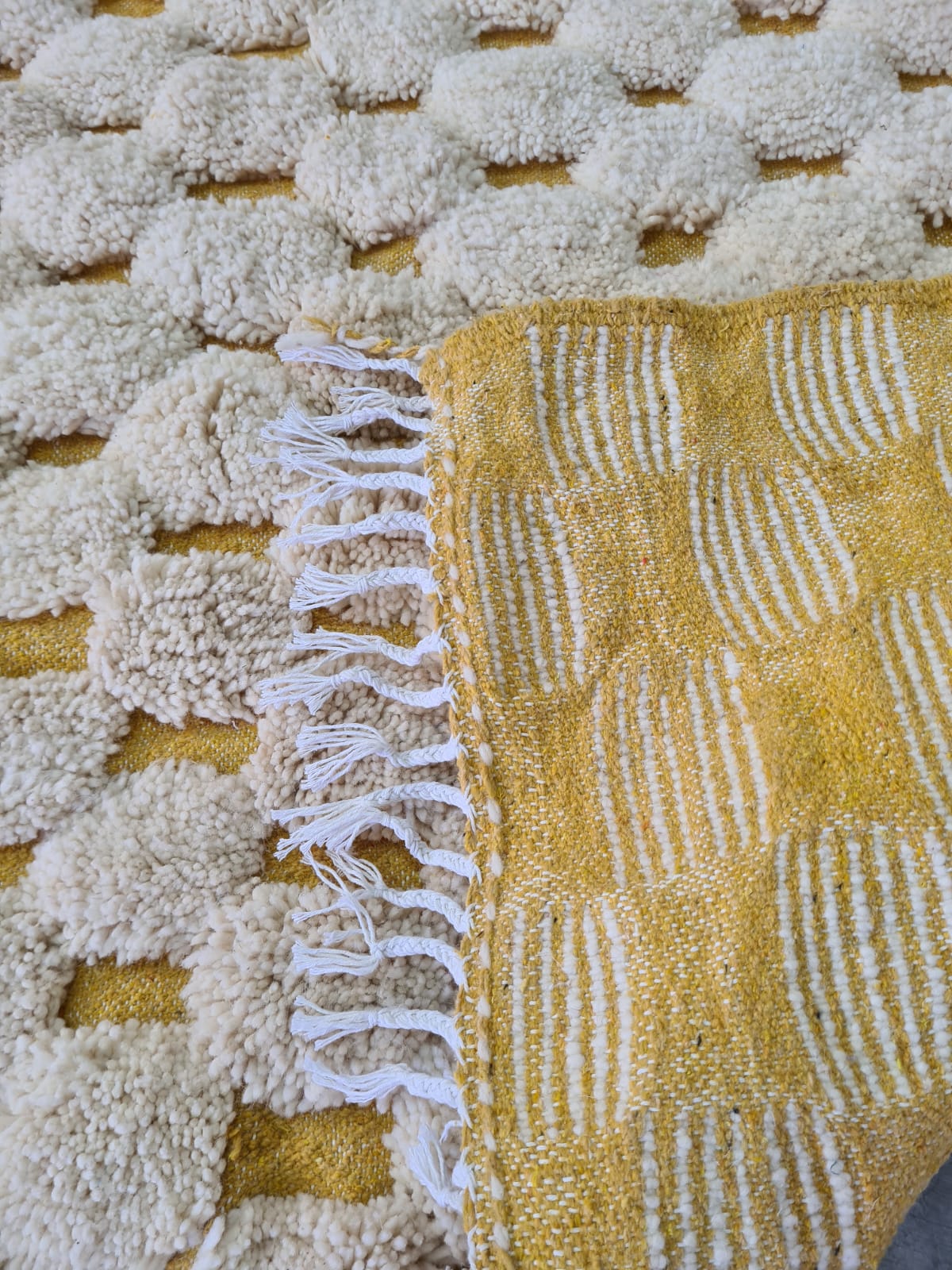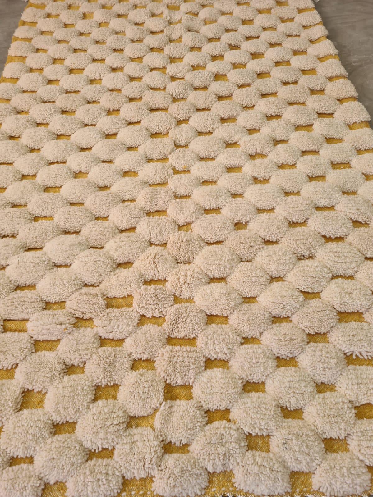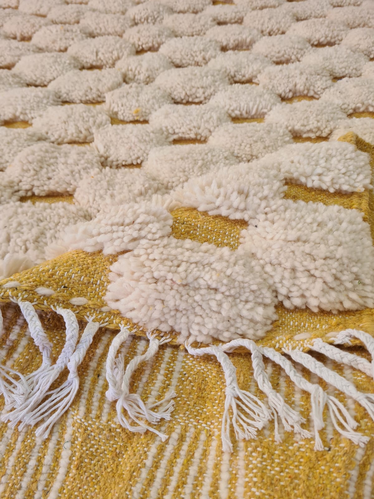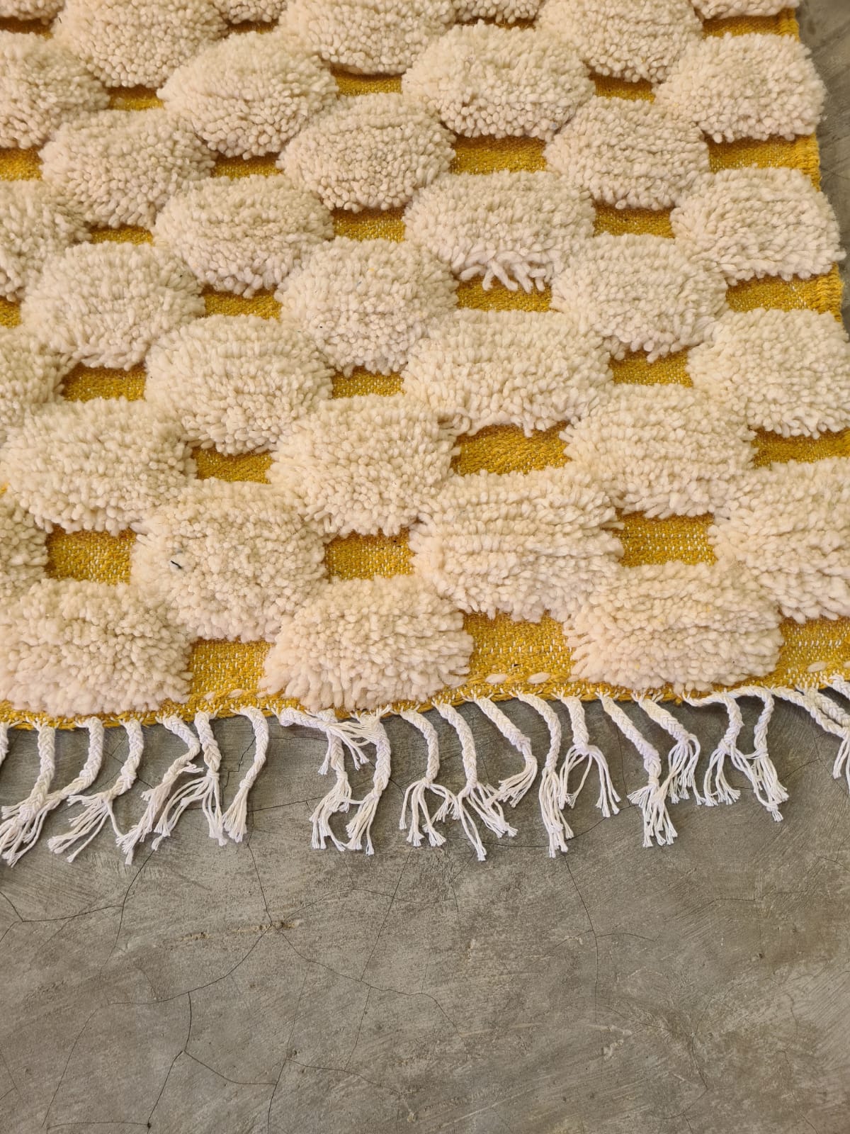 Golden Tesserae is a Beni Mrirt creation that draws its visual rhythm from repetition and relief. Handwoven in the Middle Atlas, this piece features a plush three-dimensional PomPom grid—each square individually sculpted in high-pile wool, forming a quilted terrain of warmth and tactility.