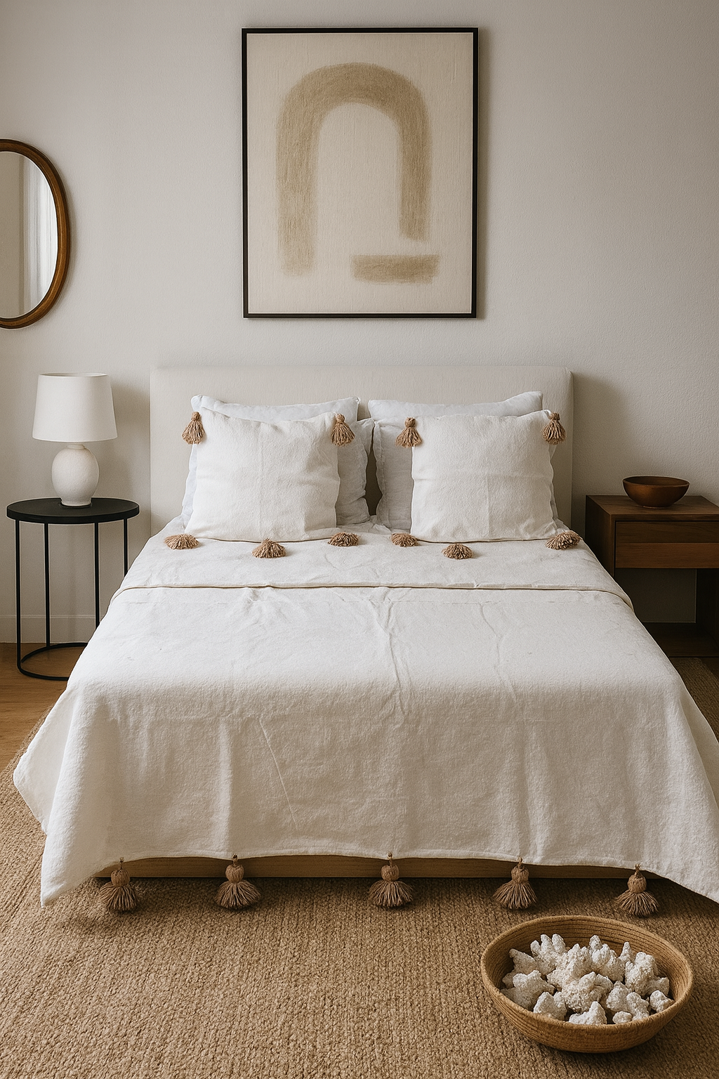 From the Atlantic workshops of Safi, this cotton set distills quiet luxury: a matte ivory ground, horizontally band-loomed for a fluid drape and finished with hand-tied camel tassels on the bedcover hem and pillow corners. Calm, breathable, and editorial.