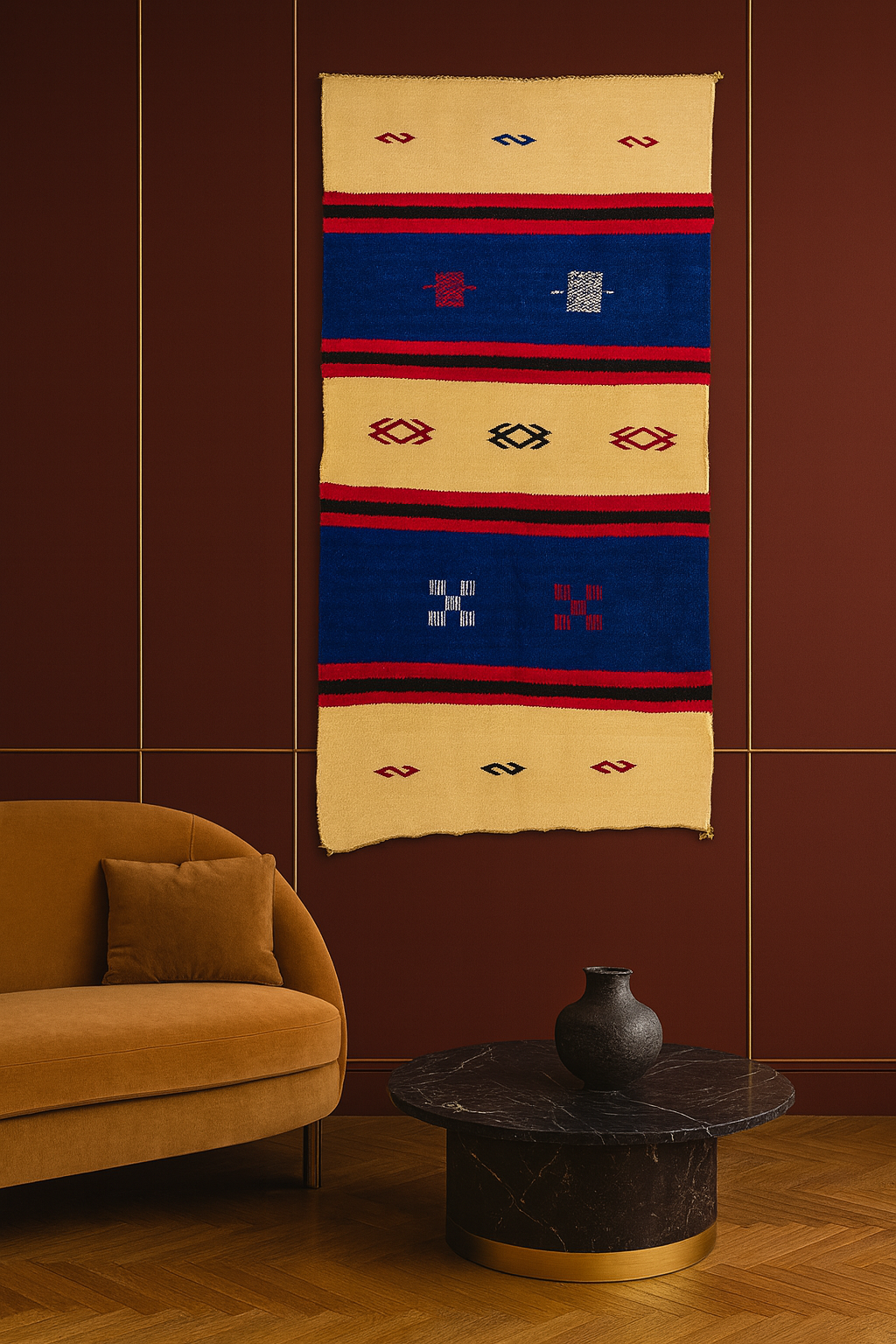Boujaad clarity—banded architecture, protective symbols, performance-grade flatweave.