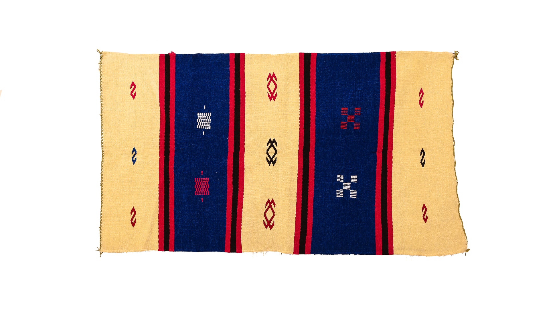 Striking and architectural, this Boujaad flatweave stacks broad indigo panels with butter-yellow lanes and slim crimson guards. Minimal Amazigh talismans—crosses, lozenges and S-motifs— punctuate the field for crisp, modern symmetry with old-world soul.