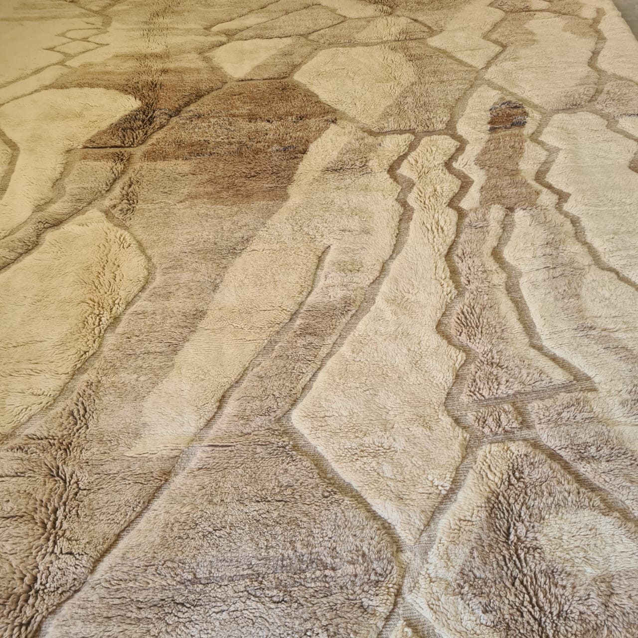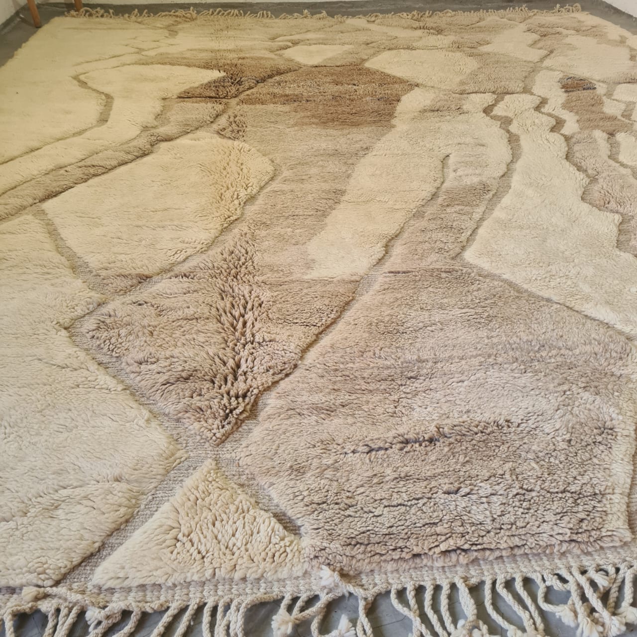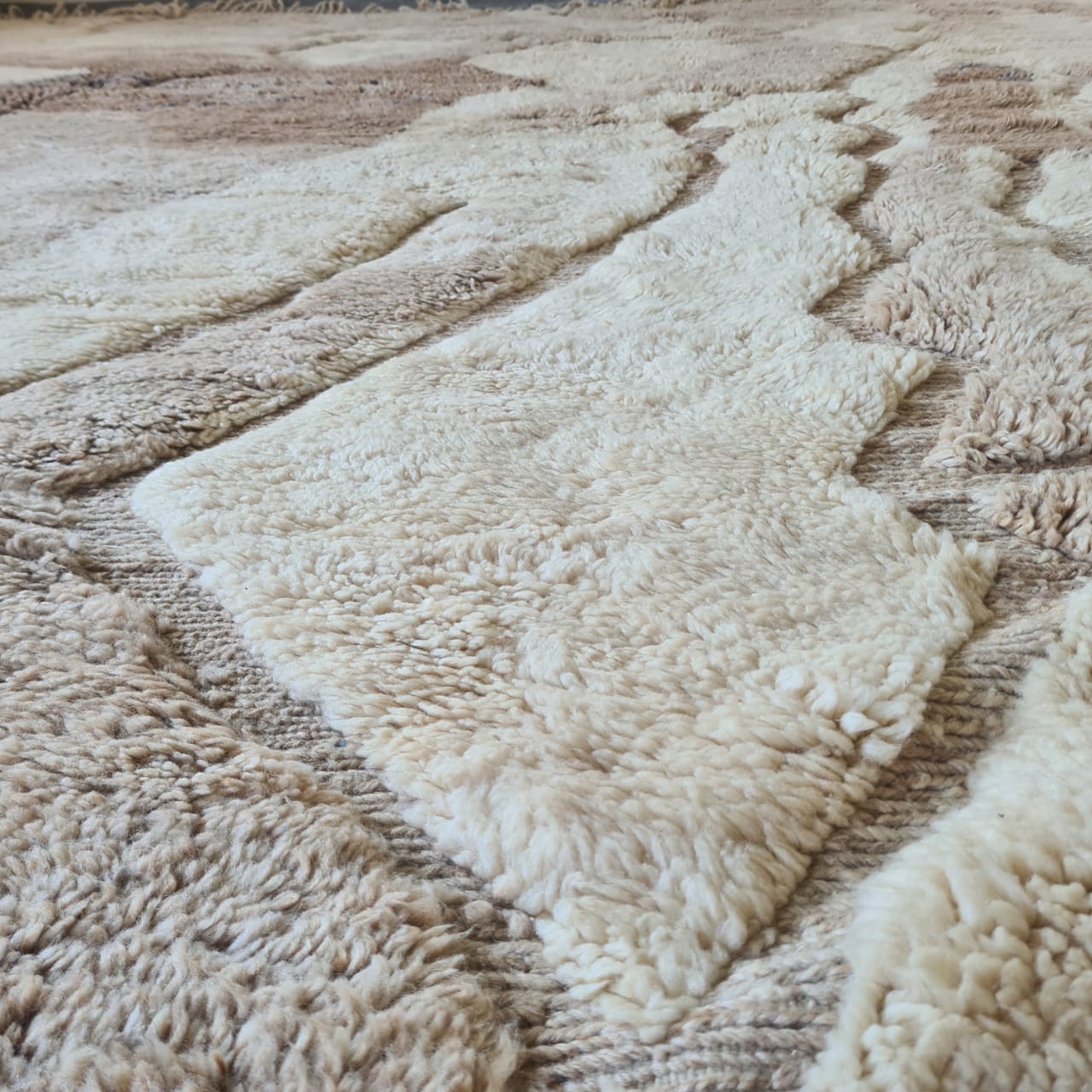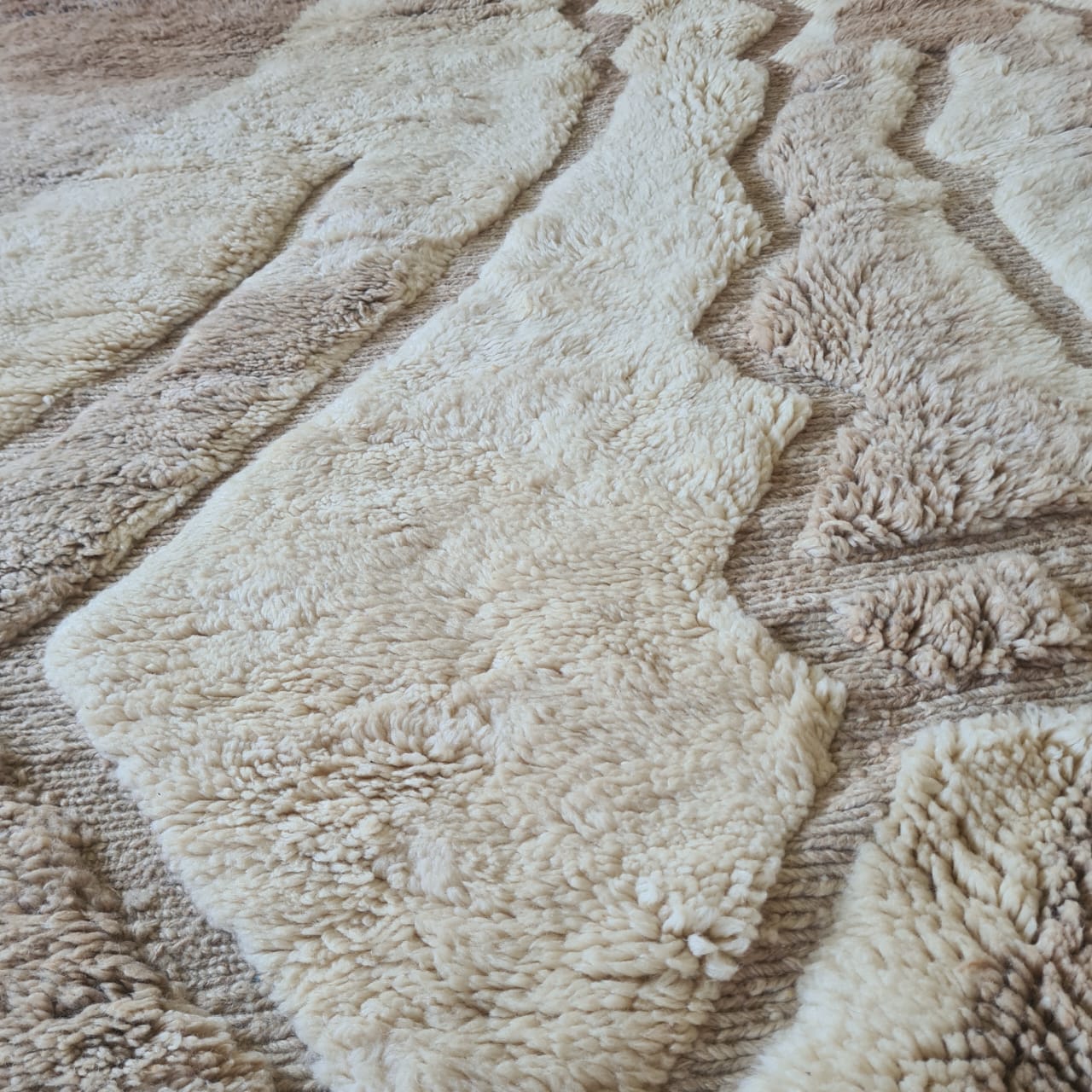 A grand-scale Beni Mrirt sculpted in tonal ivory–sand wool. The field is drawn in softly stepped bands and organic strata, carved in high/low relief to catch light across the surface. Flatweave aprons and natural fringe finish the edges — luxurious presence, quietly architectural.