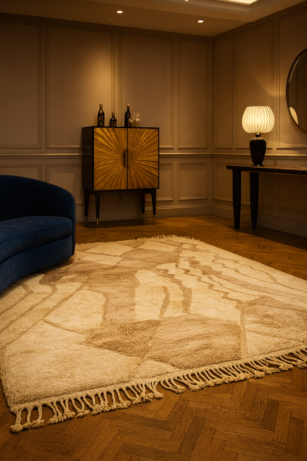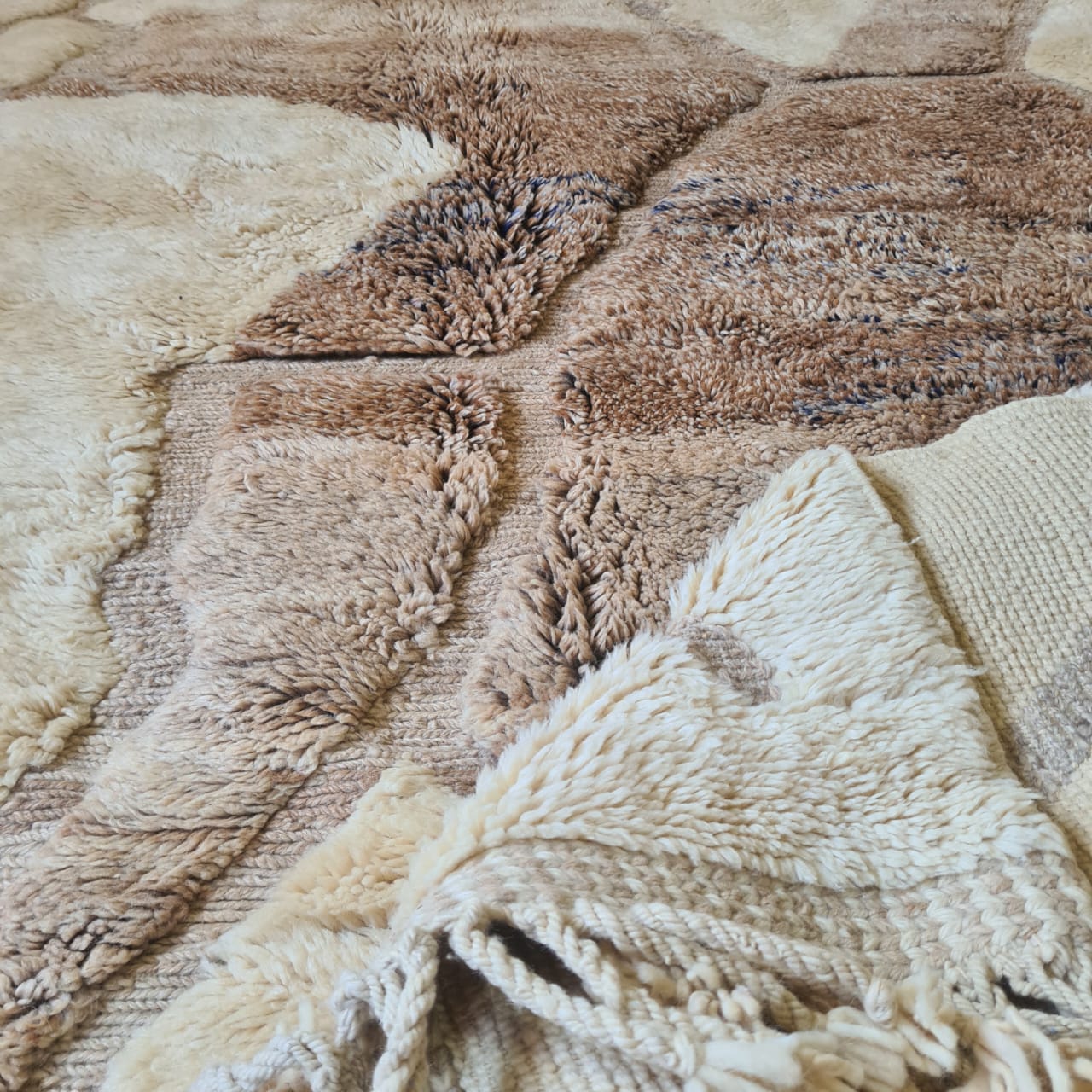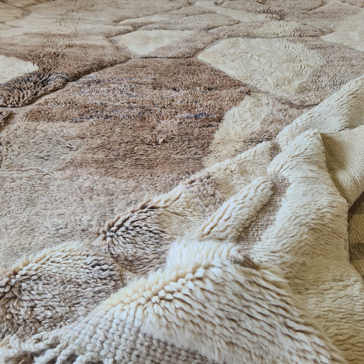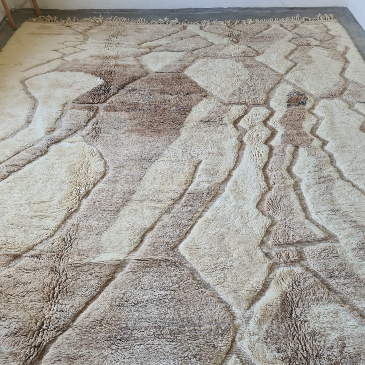 A grand-scale Beni Mrirt sculpted in tonal ivory–sand wool. The field is drawn in softly stepped bands and organic strata, carved in high/low relief to catch light across the surface. Flatweave aprons and natural fringe finish the edges — luxurious presence, quietly architectural.
