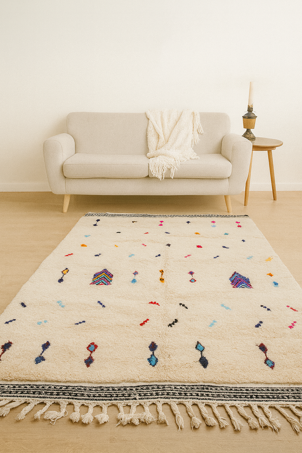 A serene Azilal with a creamy, snowfield ground scattered with petite talismanic dots, bow-ties, and chevrons in sapphire, fuchsia, teal, and saffron. Minimal composition, joyful accents—quiet luxury with a playful Amazigh cadence. Black-and-ivory kilim end finish with fringe.