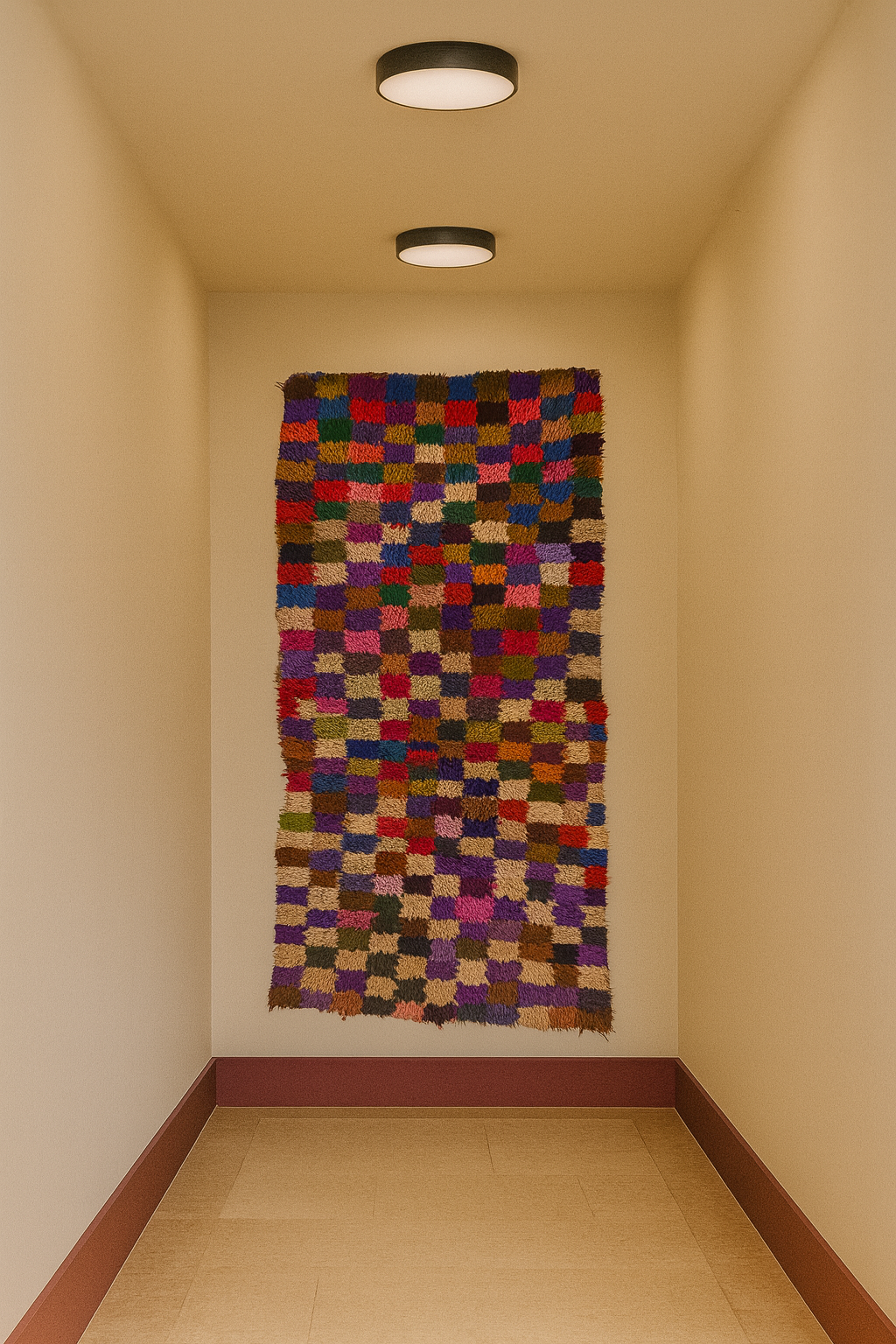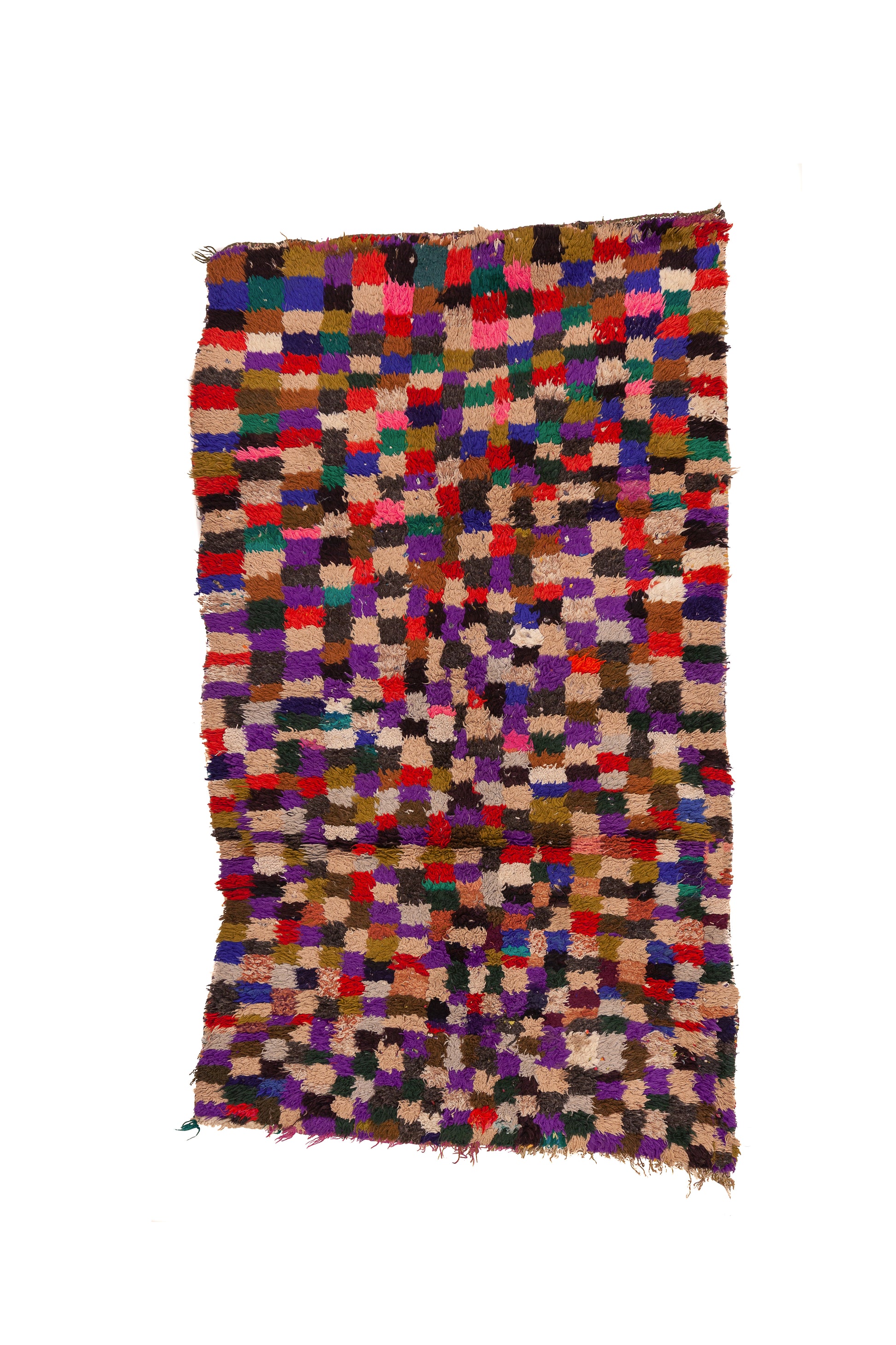 Lush and joyful, this boucherouite lays a mosaic of shaggy color blocks—plum, sand, umber, emerald, carmine and violet—creating a lively checker rhythm with soft, inviting texture.