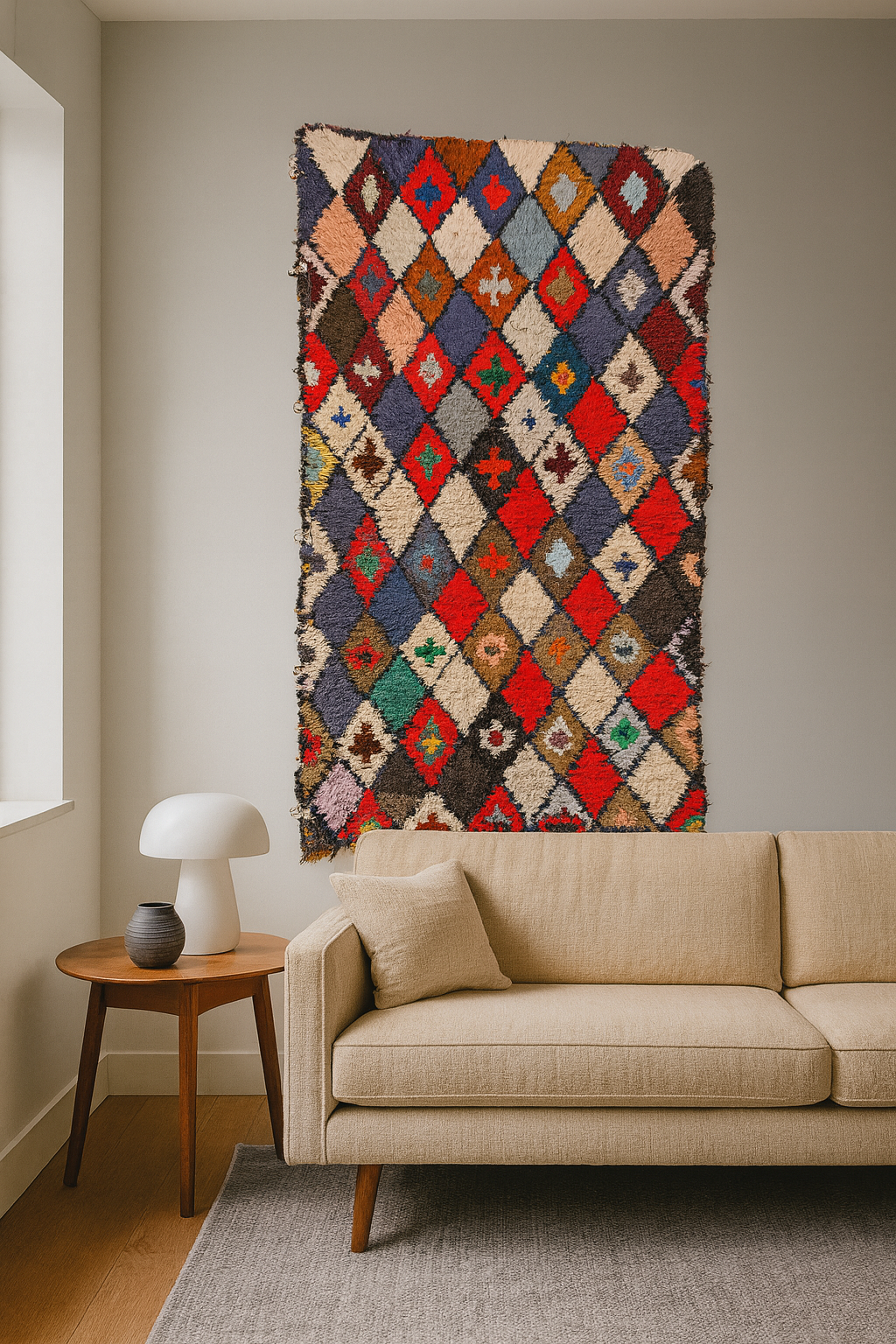 A dense field of interlocked lozenges—crimson, indigo, clay, ivory—each dotted with talismanic starlets. The rhythm reads as a protective lattice with a lively, contemporary color cadence sized for living rooms, bedrooms, and layered salons.