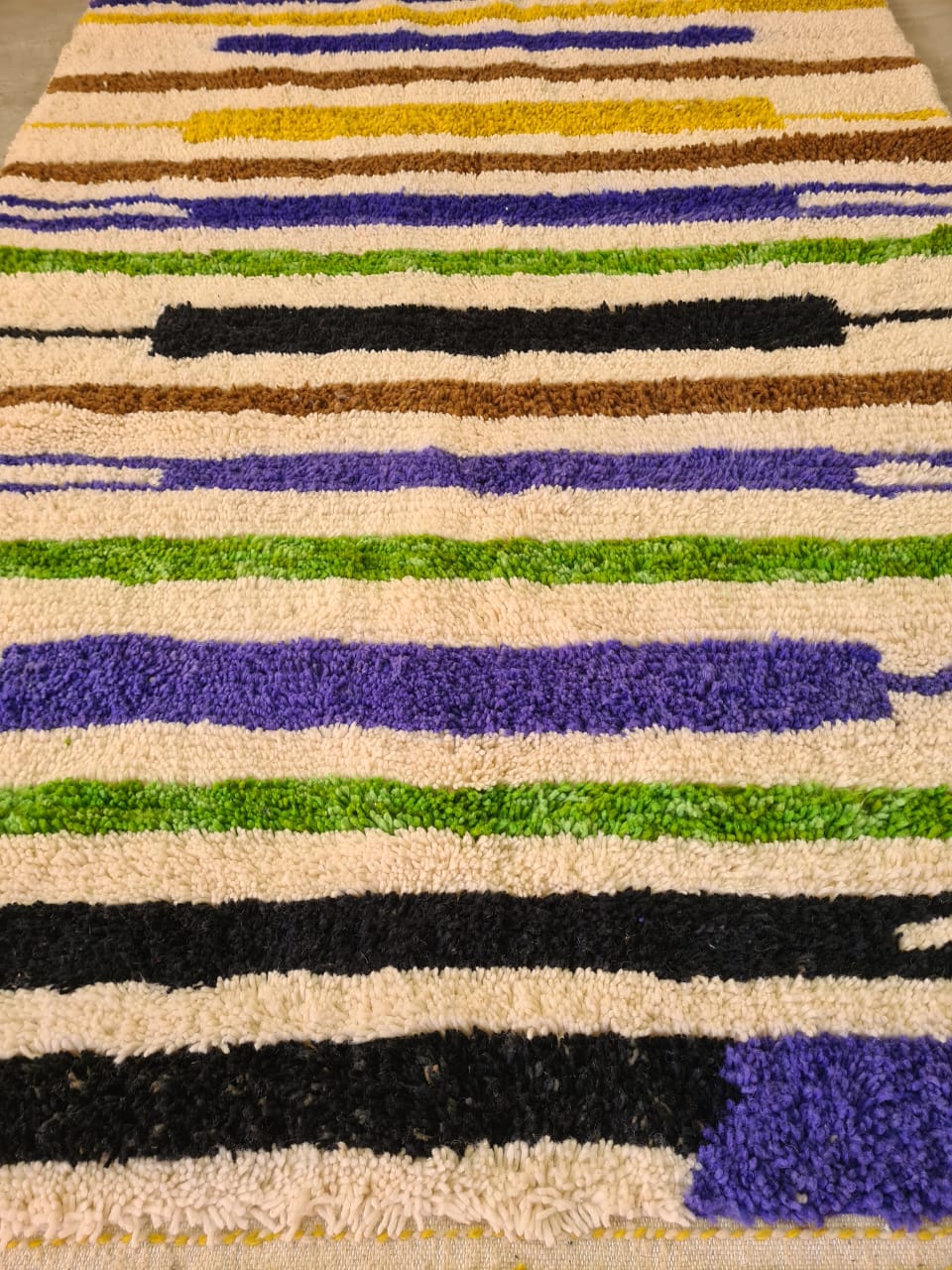 Rhythms of the Atlas transforms the ancestral double-knot technique of Boujaad into a bold, linear composition. Stripes of violet, green, black, and earth tones intersect over an ivory field, evoking both the disciplined geometry of weaving and the spontaneous energy of hand-dyed wool.