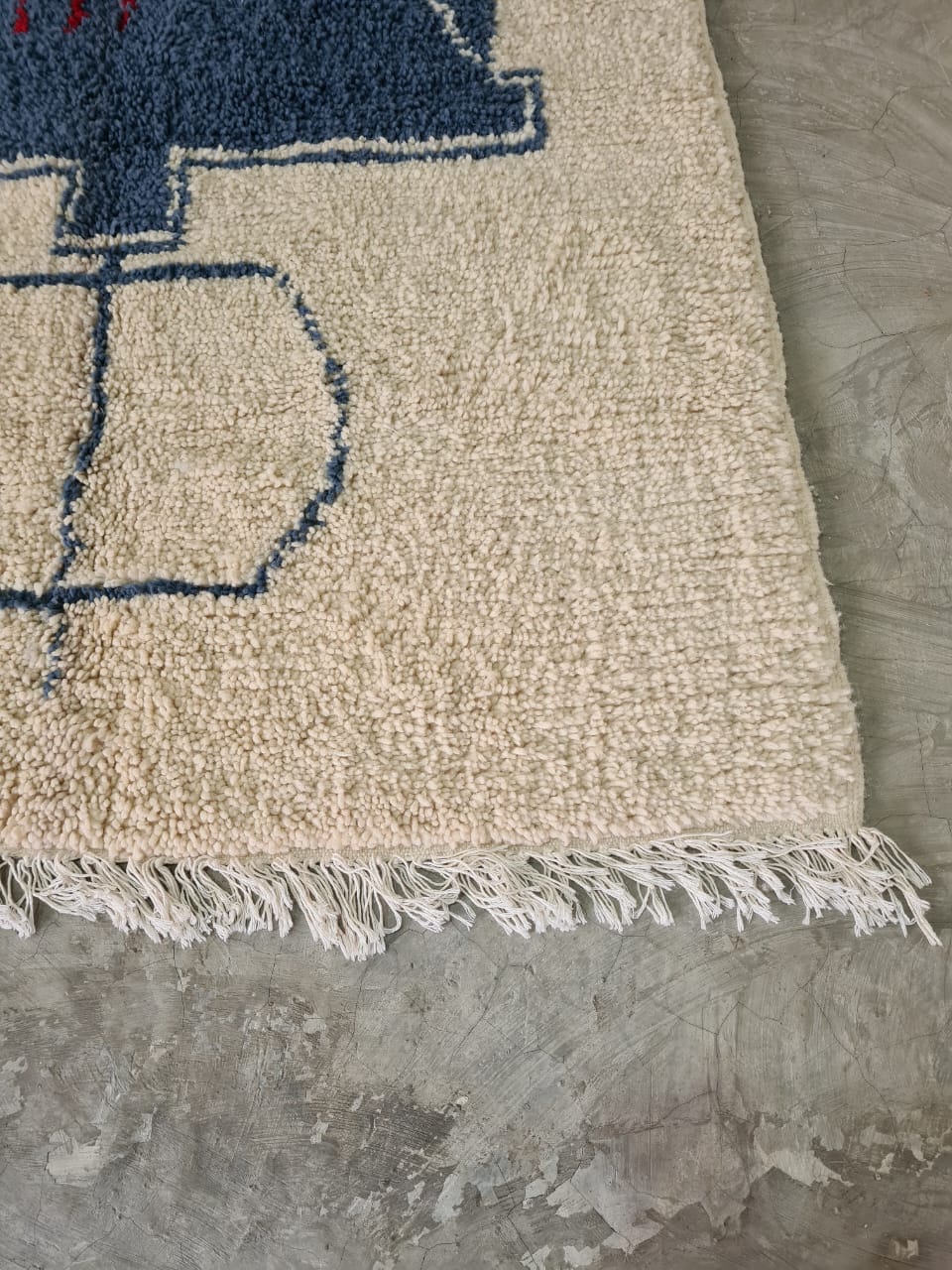 Guardians of the Loom is a narrative-rich rug from the Beni Mrirt region, featuring the iconic blue Amazigh fibule—a symbol of protection and ancestral strength. Woven into a neutral ivory wool base, this rug carries a dialogue between ancient identity and minimalist geometry.