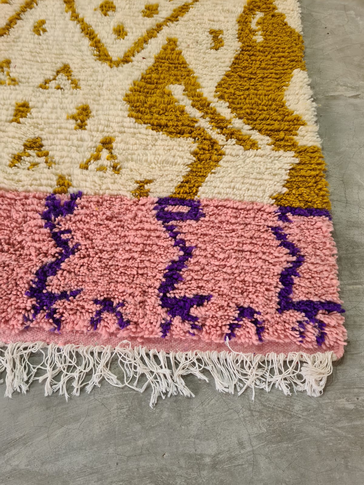 The Golden Fields is a deeply symbolic carpet from the heart of the Middle Atlas, evoking the sacred feminine through color, form, and rhythm. Designed as a tribute to the moment of conception and fertility, it features a striking ochre-yellow ground—symbolic of fertile earth—interspersed with violet and rose figures that narrate the transformative journey of womanhood.