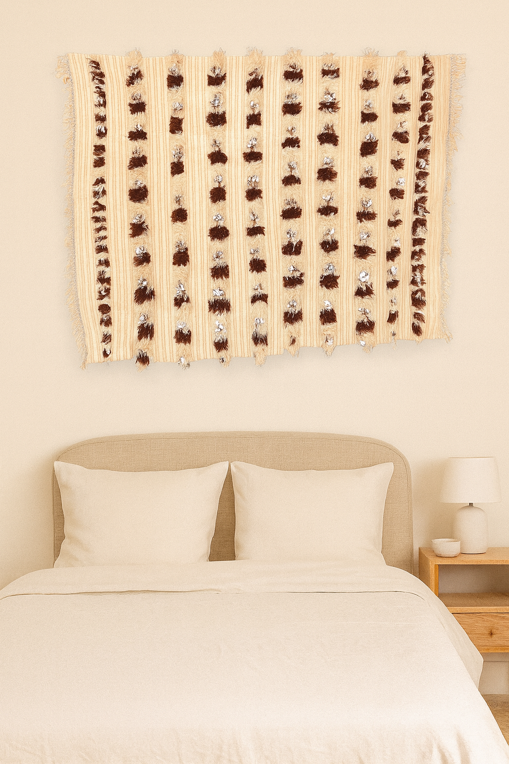 A luminous Beni Ourain Handira (wedding blanket) in cream with vertical columns of tuft knots and scattered sequins. Historically worn by the bride, its glimmer and texture embody blessing, protection, and joyful abundance.
