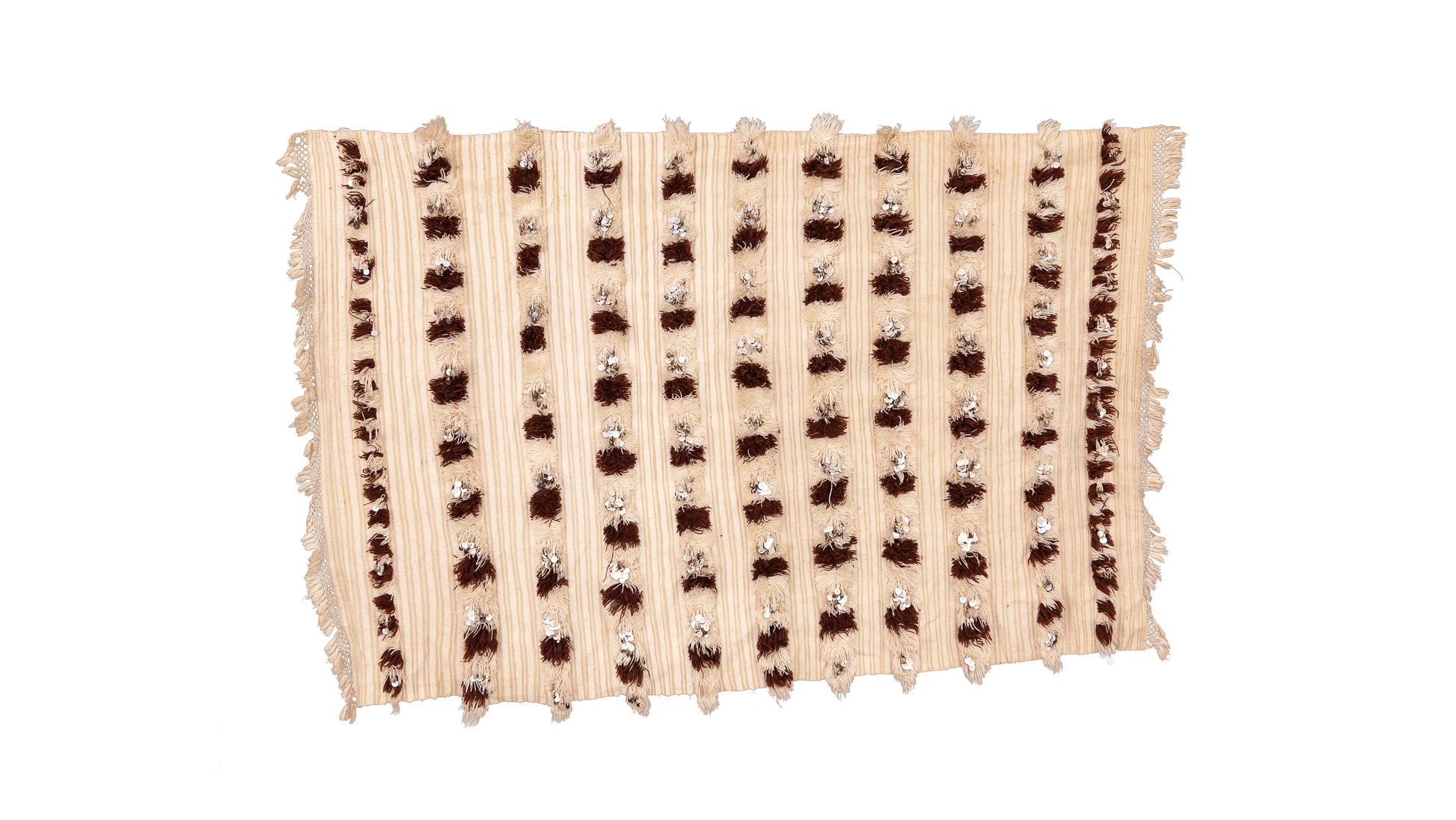 Hand-woven flatweave with ribbed bands; hand-applied sequins (mouzouna) and soft tuft accents. Supple drape with a gentle, tactile shimmer.