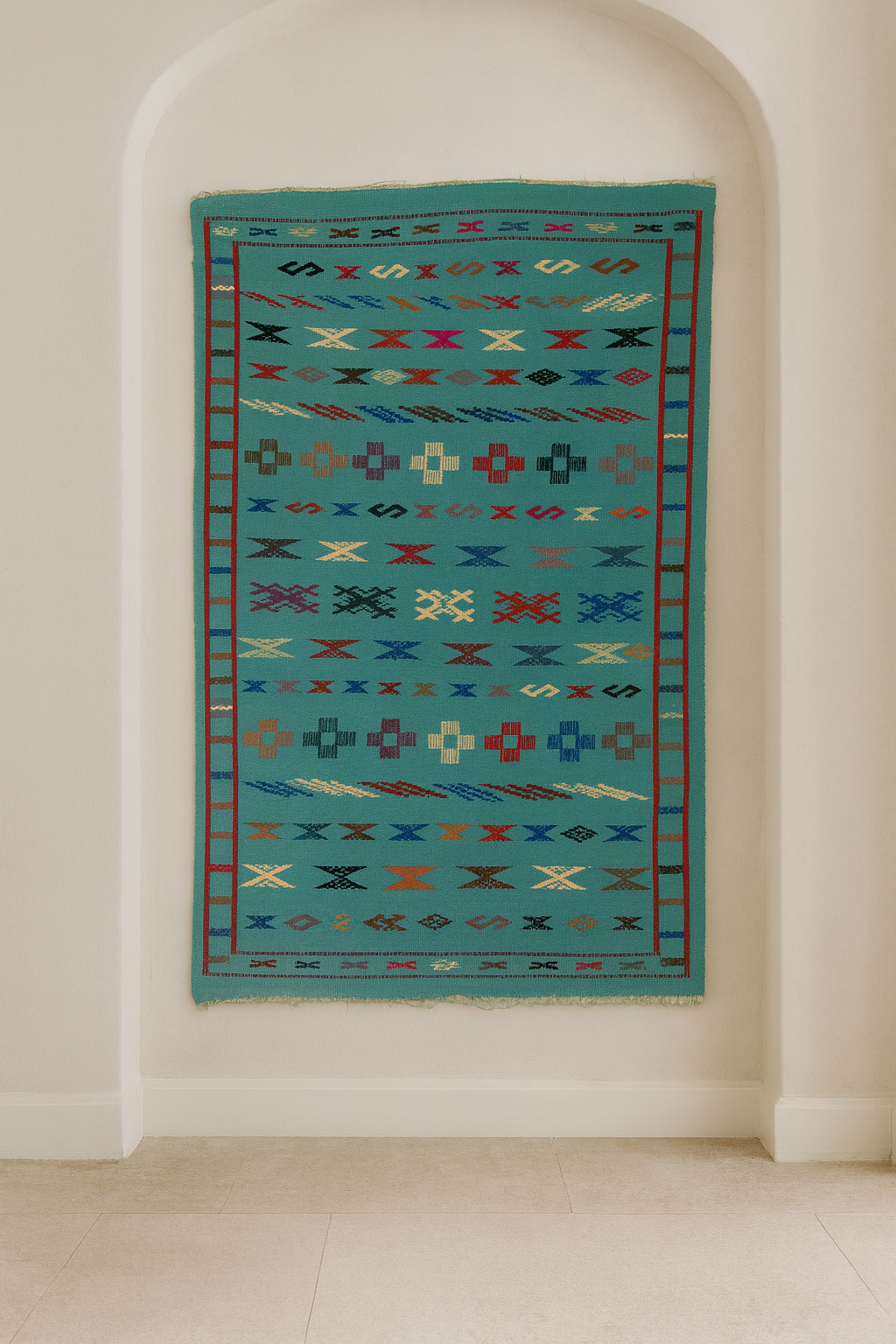 Boujaad clarity—teal luminosity, protective symbols, performance-grade flatweave.