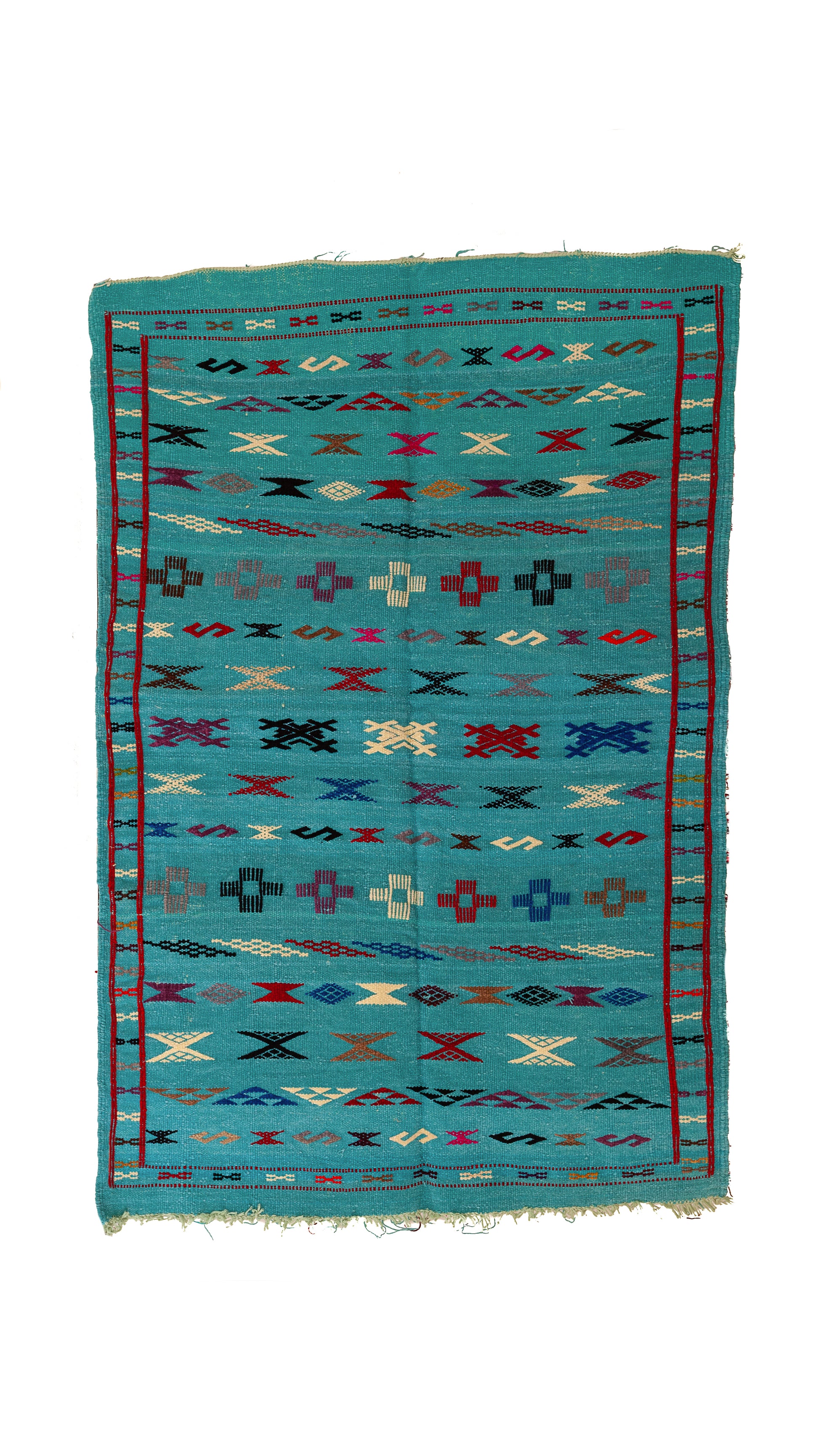 Luminous and agile, this Boujaad flatweave sets a verdigris/teal field within slim red guards, banded with brocaded lozenges, chevrons, wave lines and protective crosses. Handwoven in the Middle Atlas in the traditional moubra technique (flatweave in wool with natural plant-fiber accents), it reads crisp, low-profile and door-clearing—engineered for daily living.