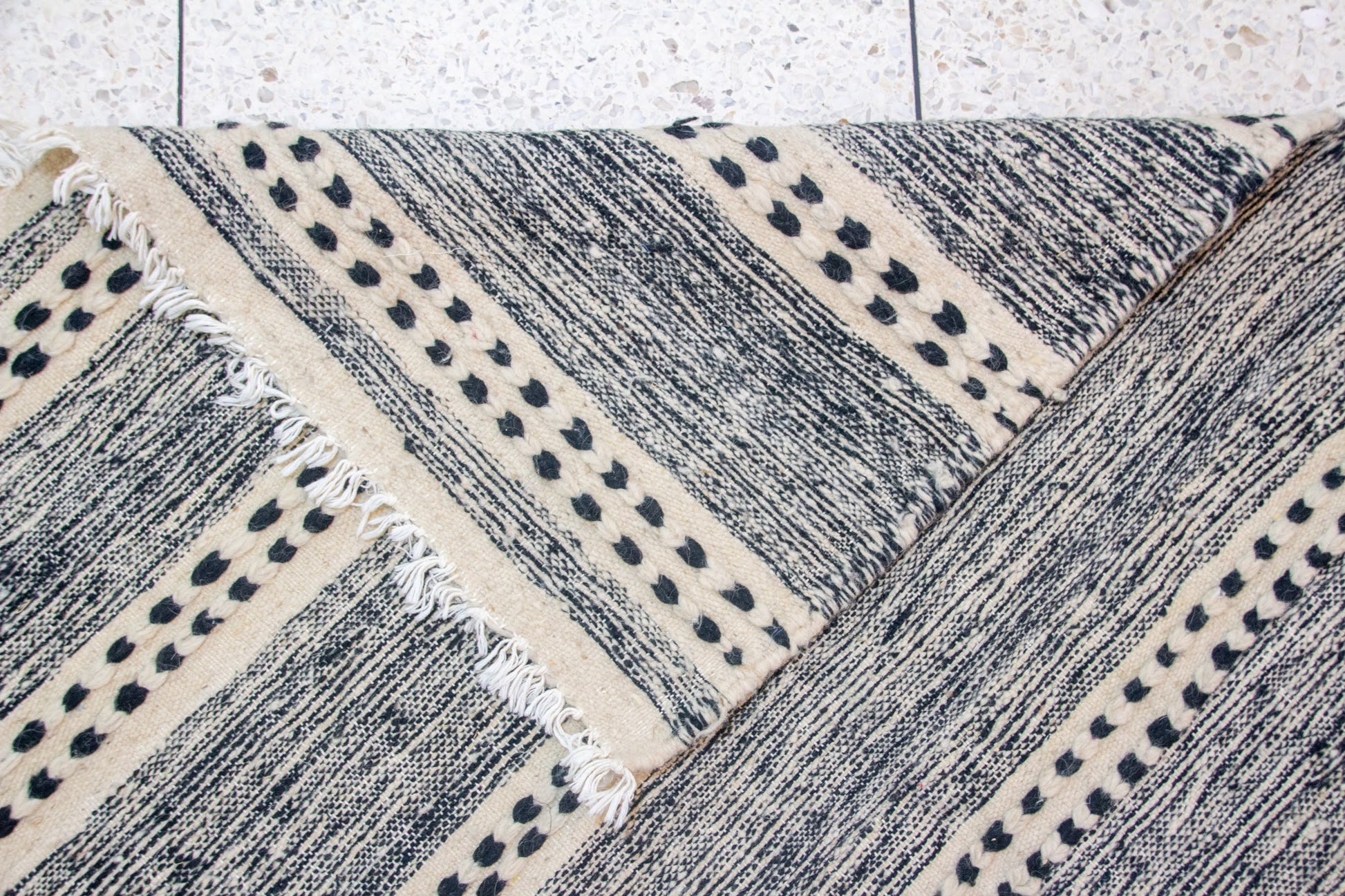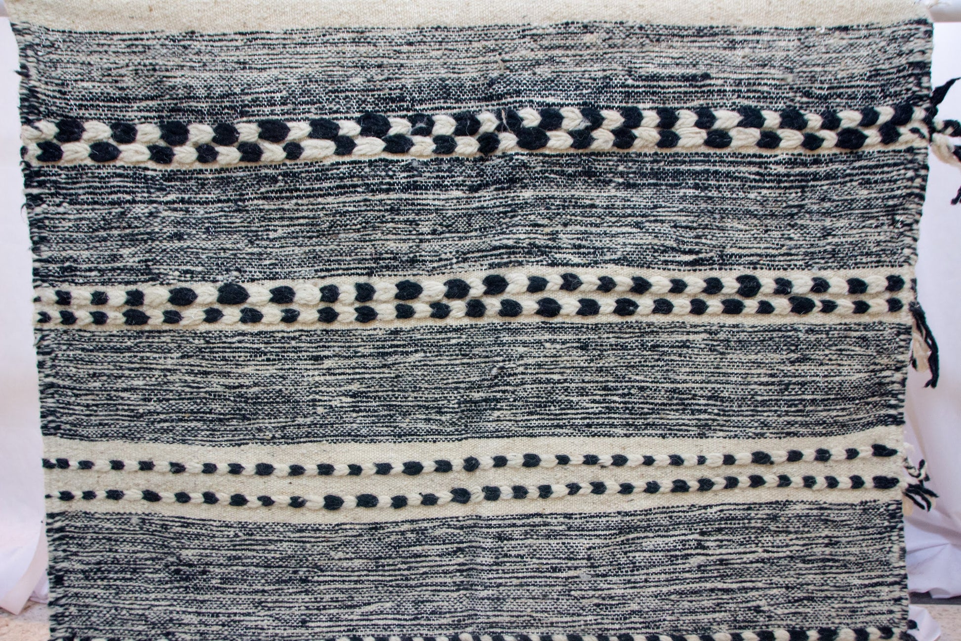 Graphic Zanafi flatweave from the Boujaad region: heathered ivory–ink stripes punctuated by relief bands of braided chevrons and dotted tufts. Minimalist, textural, and unmistakably Middle Atlas.