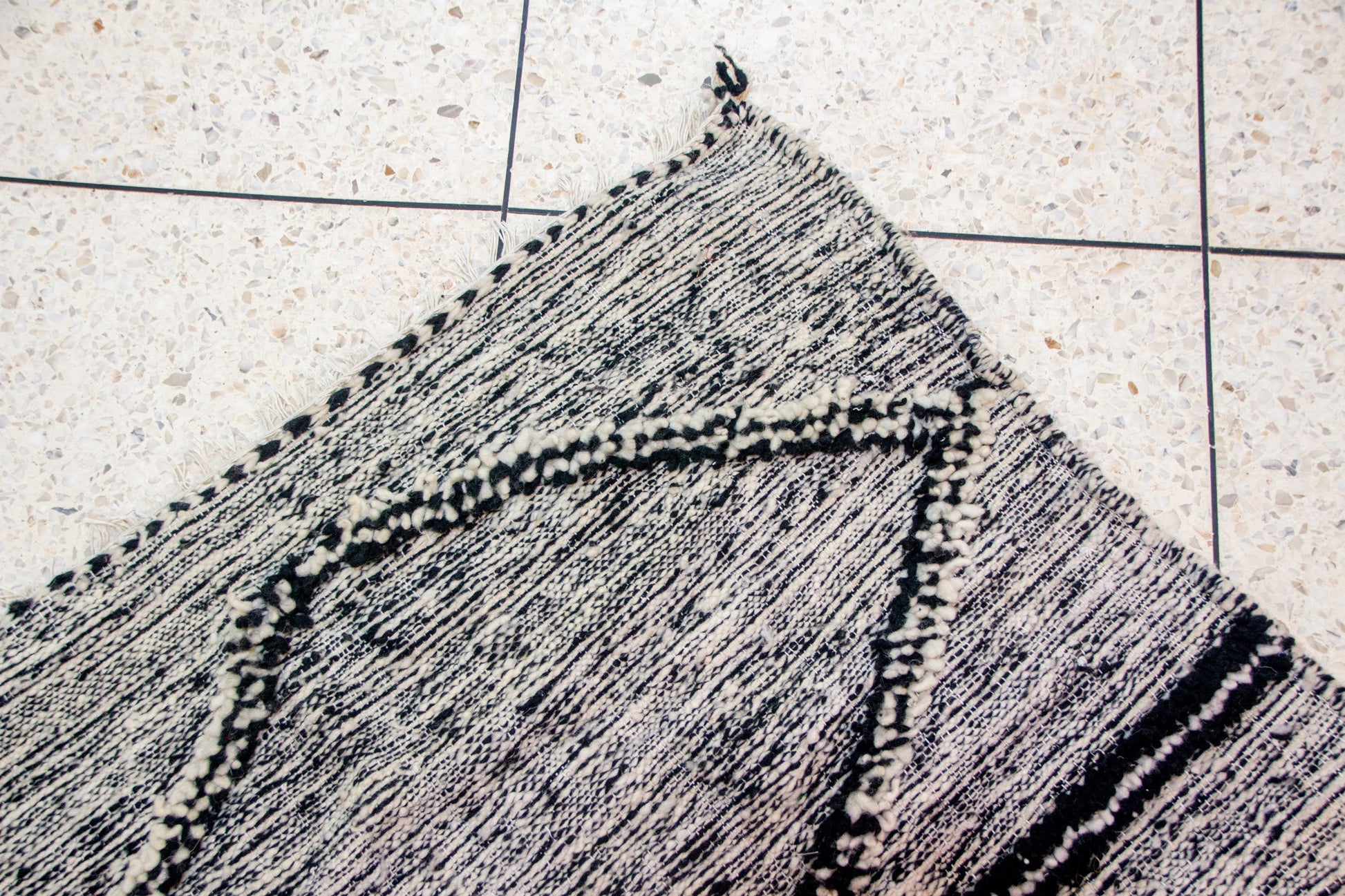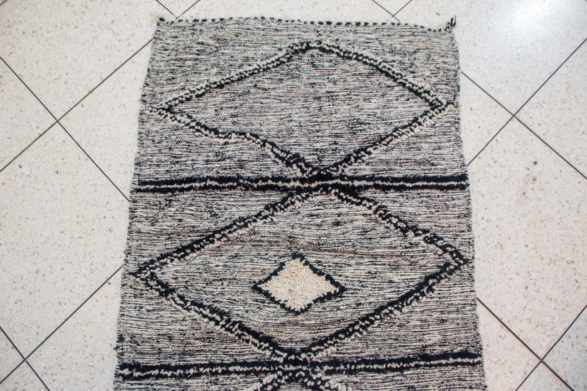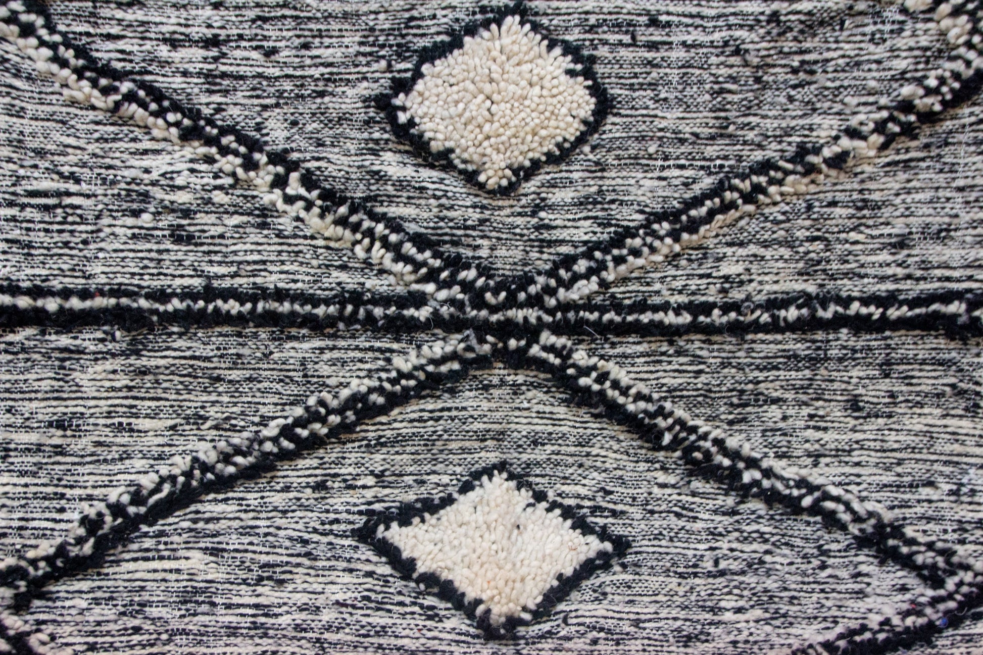 Handwoven Zanafi flatweave from the Boujaad plateau. A heathered ivory–ink ground is crossed by braided relief bands that draw stacked diamond medallions; two are filled with soft ivory pile for sculptural contrast. Graphic, textural, and unmistakably Amazigh.