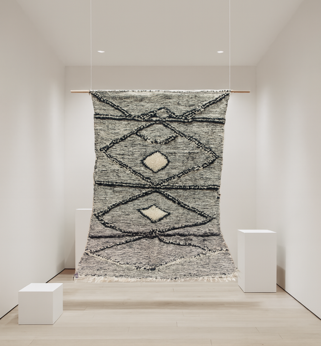 This rug is an original sample from our weaving workshop. Every stitch is handcrafted using undyed or plant-dyed wool sourced from the Atlas. The motifs, symbols, and size can all be reimagined to reflect your own vision.