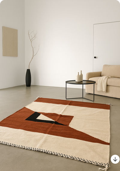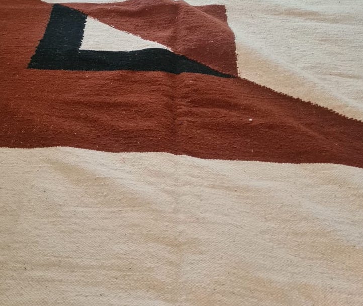 A clean, architectural Zanafi Boujaad flatweave: an ivory ground cut by terracotta planes and a charcoal triangle, finished with Zanafi’s braided ends. The composition reads modern while the technique remains unmistakably Amazigh.